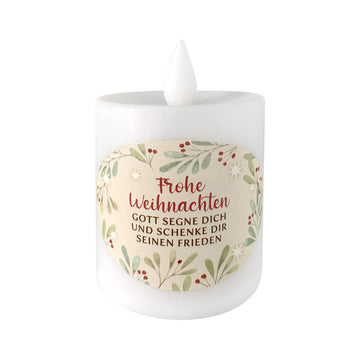 Moderne LED-Dauerkerze mit fest verbauter Flacker-LED und Etikett "Frohe Weihnachten - Gott segne Dich und schenke Dir seinen Frieden".