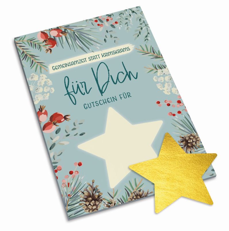 Gemeinsamzeit statt Krimskrams - originelle Gutschein-Postkarten mit einem Feld für eigene Eintragungen, gedruckt auf extra-starkem Karton. Sie werden mit dem passenden selbstklebenden Rubbeletikett geliefert. Einfach die Gutschein-Idee in das Feld schreiben, Etikett aufkleben und schenken. Der oder die Beschenkte kann dann das Feld freirubbeln und das Geschenk entdecken.