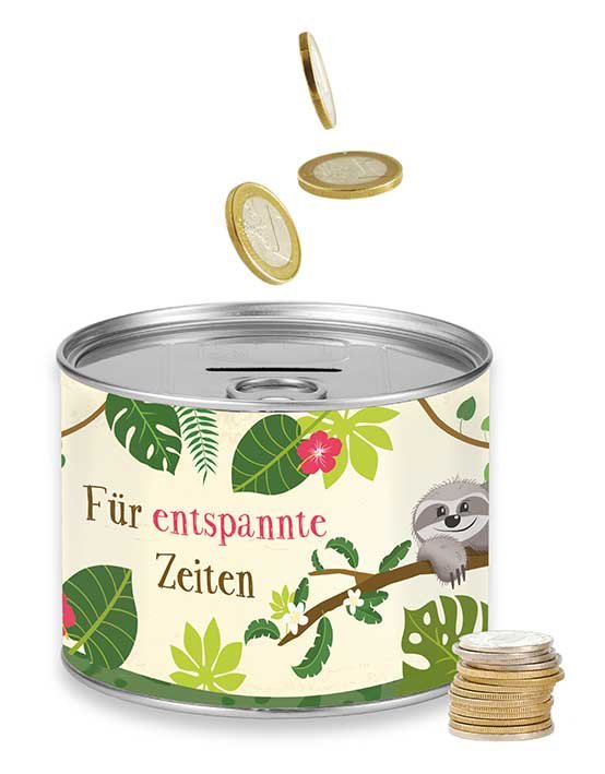 Diese Spardose "Für entspannte Zeiten" wartet nur darauf, gefüllt zu werden. Ob große oder kleine Wünsche, wer in dieser liebevoll-fröhlichen Metalldose Geld sammelt, wird nicht lange auf die Erfüllung seiner Träume warten müssen. Mit einem Durchmesser von 10 cm und einer Höhe von 7,5 cm passt einiges an Geld in die Dose. Und ist sie schließlich ausreichend gefüllt, kann sie mithilfe des eingebauten praktischen Dosenöffners rasch geleert werden ...