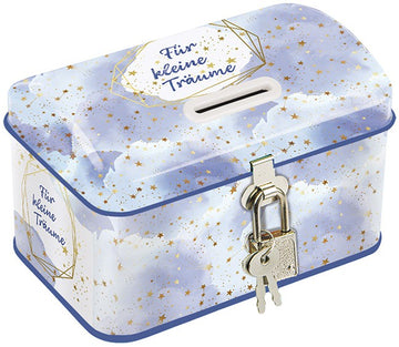 Blechspardose, liebevoll gestaltet, mit Schloss und Schlüssel.