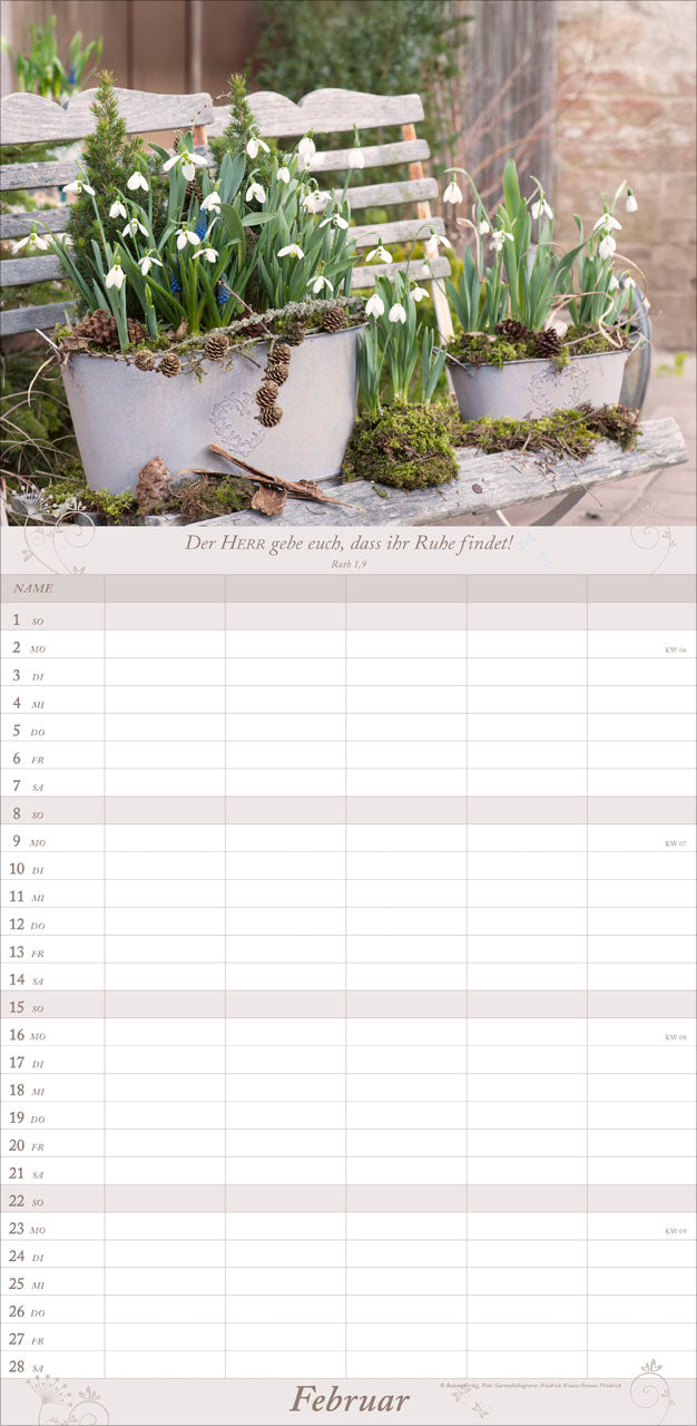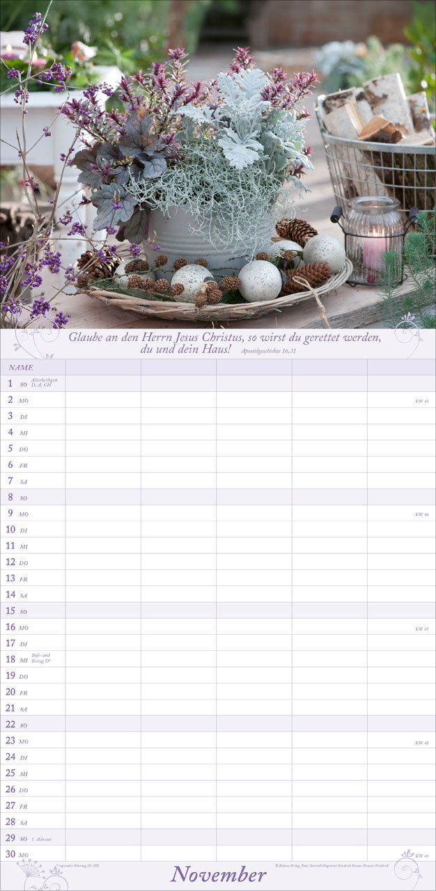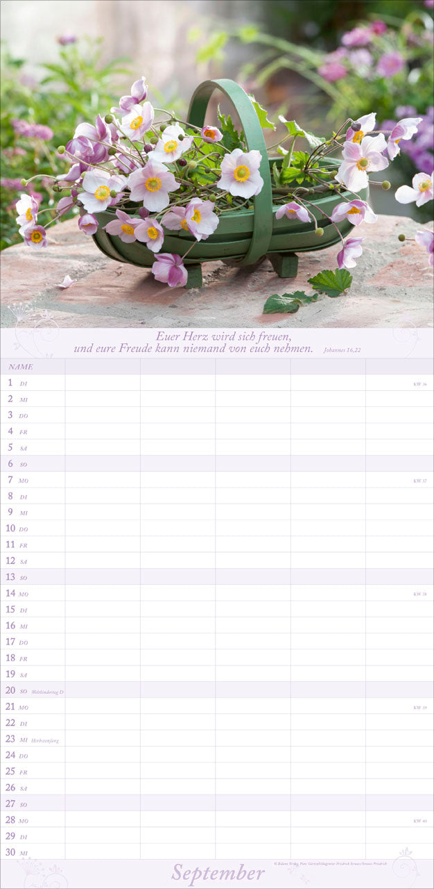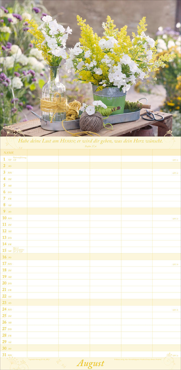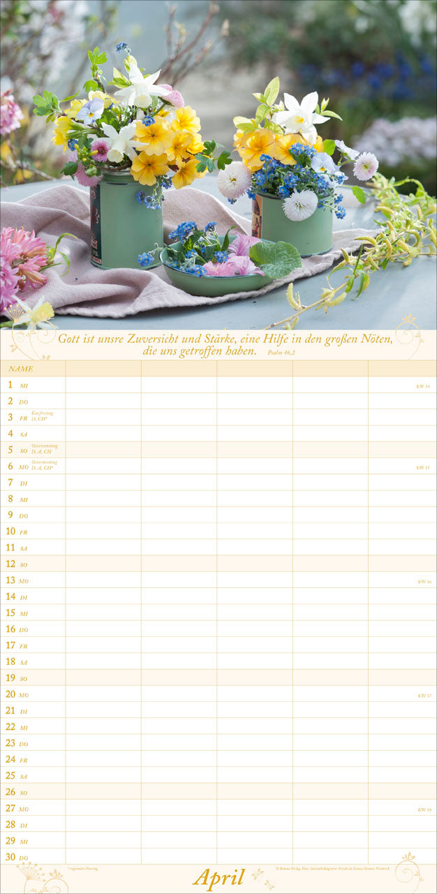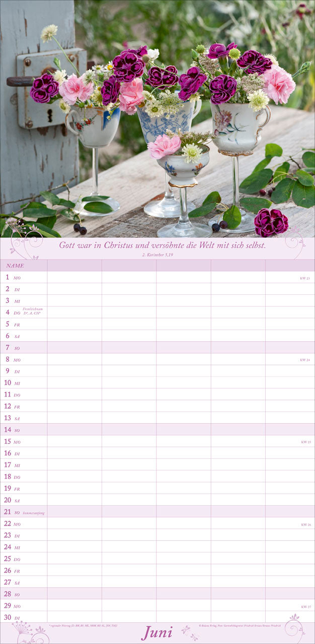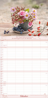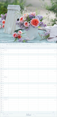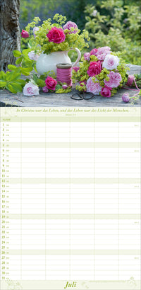 Dank dieses farbenfrohen Familienplaners vergessen Sie keine Termin mehr. Fünf Spalten bieten Platz für jede Menge Termine und Eintragungen. Last but not least bringen Ihnen die Bibelworte und Zitate Gottes Wort näher und begleiten die Familie den ganzen Tag.