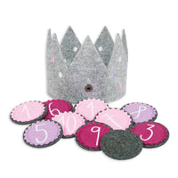 Das Set besteht aus einer Krone mit 10 Zahlenbuttons (1.-10. Geburtstag), zu befestigen mit rückseitigem Druckknopf