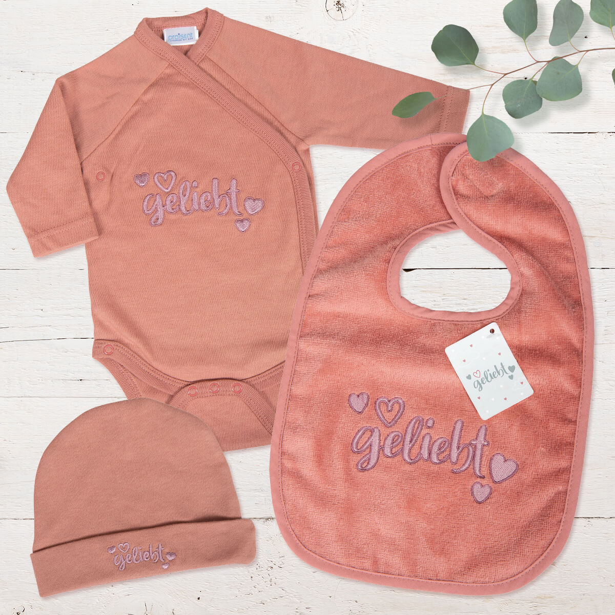 Niedlicher Baby-Body mit langen Armen aus weichem, anschmiegsamen Stoff mit hochwertiger Stickerei "geliebt" und kleinen Herzen.