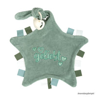 Das Baby-Schmusetuch in der Trendfarbe Salbei bestickt mit "geliebt" und kleinen Herzen auf der samtigen Velours-Oberfläche hat eine ideale Größe. Ein besonders liebevolles Geschenk zur Geburt oder Taufe (auch in altrosa (6497082) erhältlich).