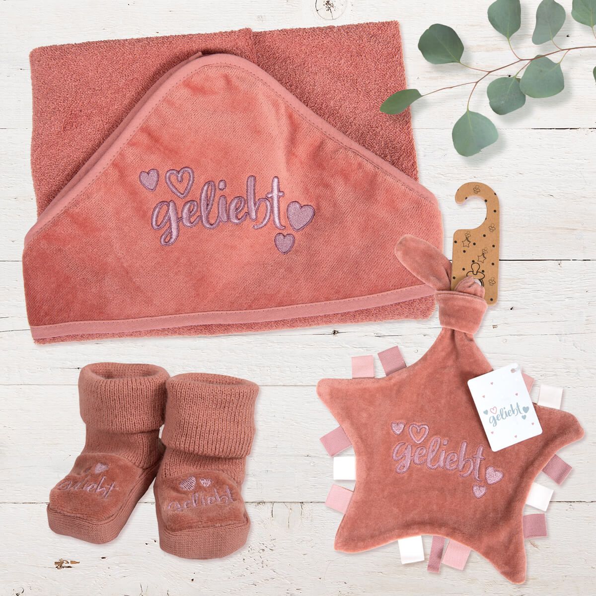 Gemütliche Baby-Söckchen in altrosa aus weichem Ripp-Jersey niedlich bestickt mit "geliebt" und kleinen Herzen. Ein besonders liebevolles Geschenk zur Geburt oder Taufe (auch in salbei unter der Nr. 6497085 erhältlich).