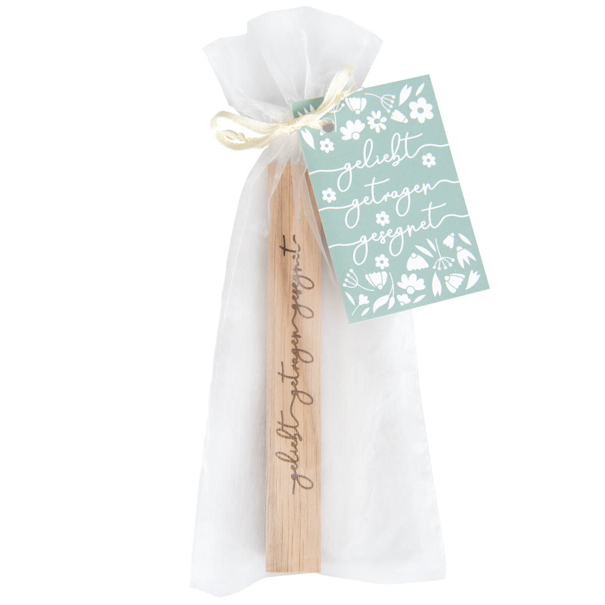 Kartenleiste aus Eichenholz, veredelt mit Lasergravur: "geliebt-getragen-gesegnet".