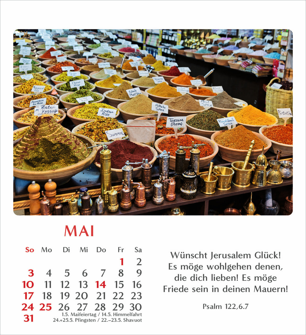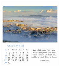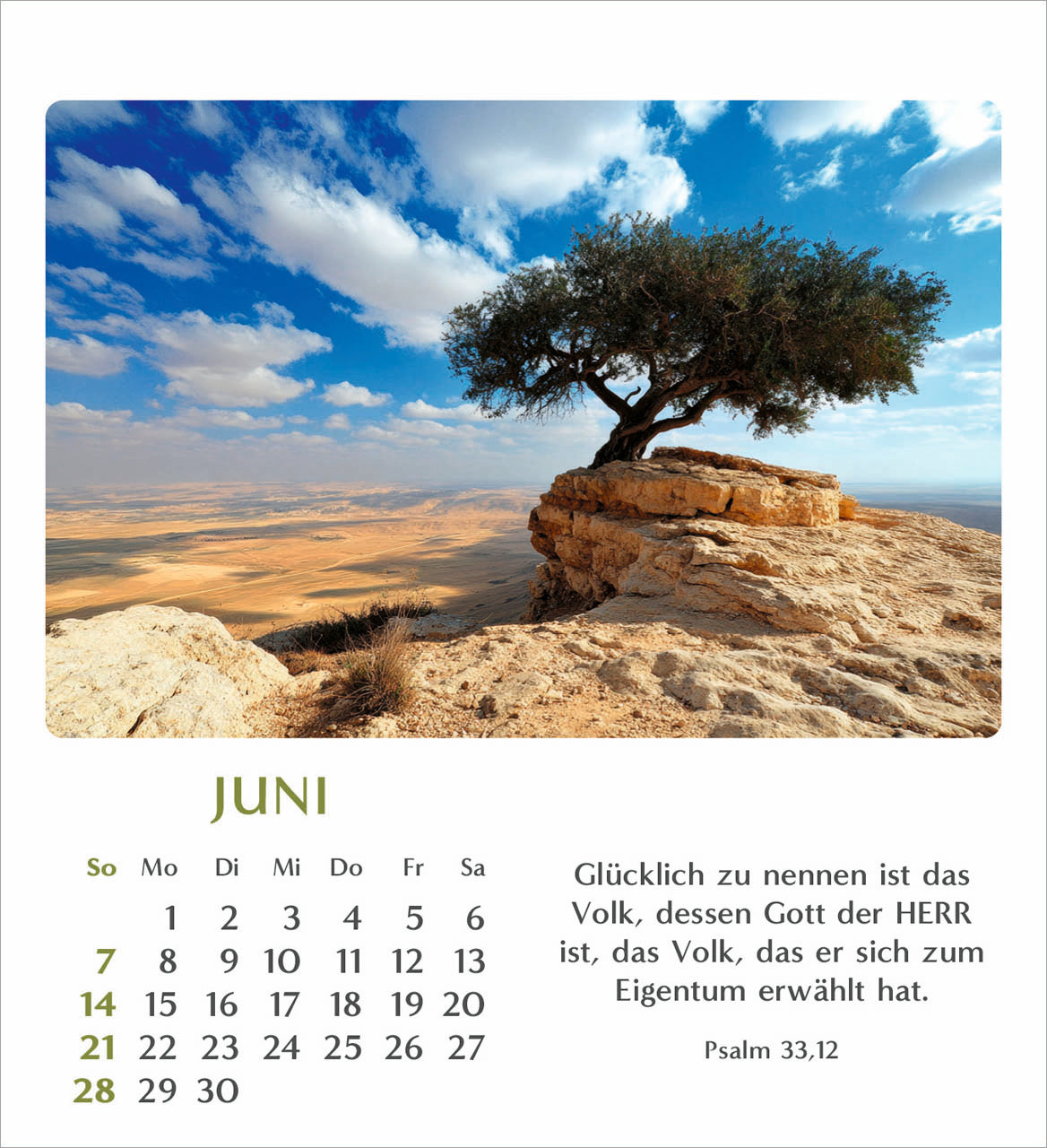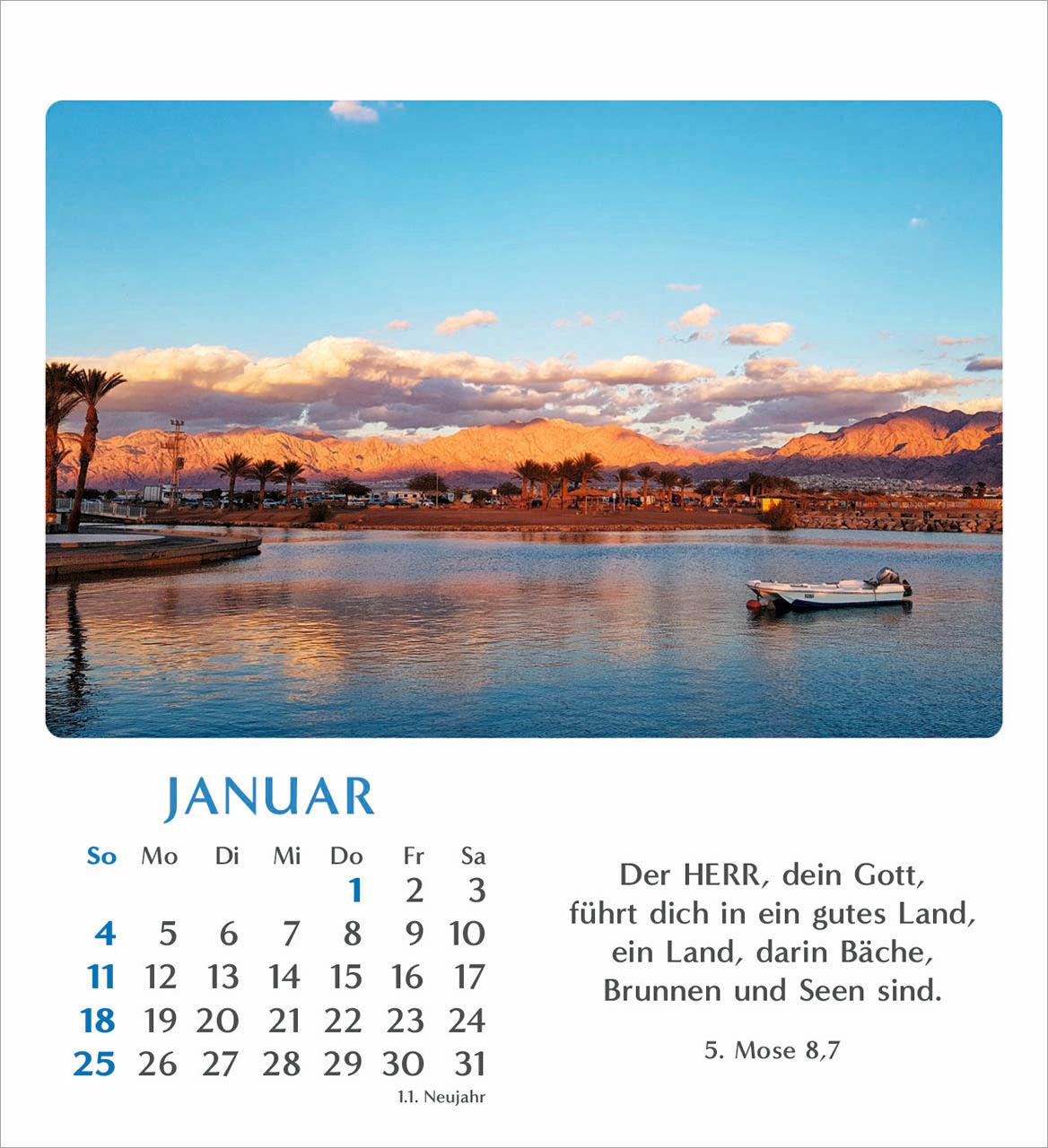 Erstaunlich vielfältig und farbenfroh begegnet uns Israel in diesem schönen Kalender. Herrliche Ausblicke aufs Rote Meer oder auf Masada, eindrückliche Bilder aus der Altstadt Jerusalems oder Impressionen aus der Wüste Negev. Ein wundervoller Bilderbogen Israels mit ansprechenden Versen aus der Bibel.