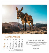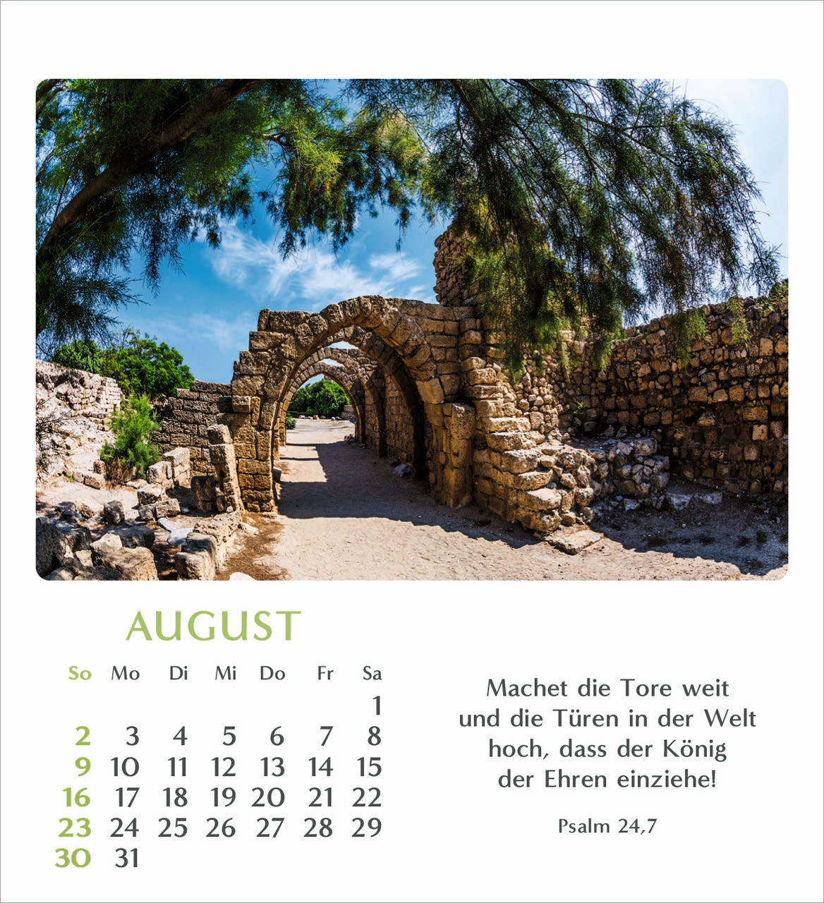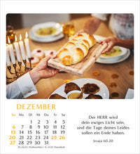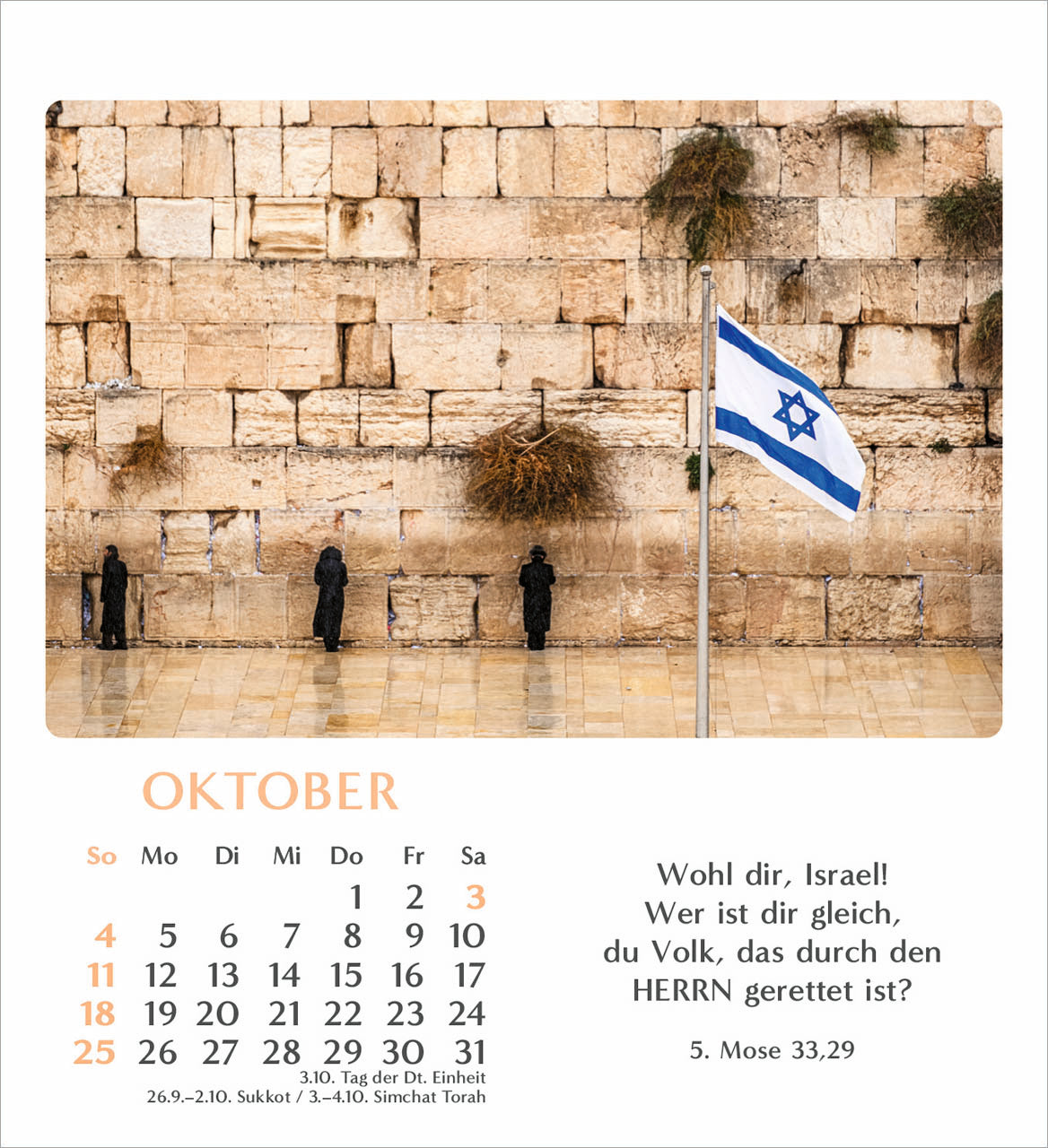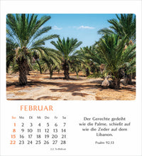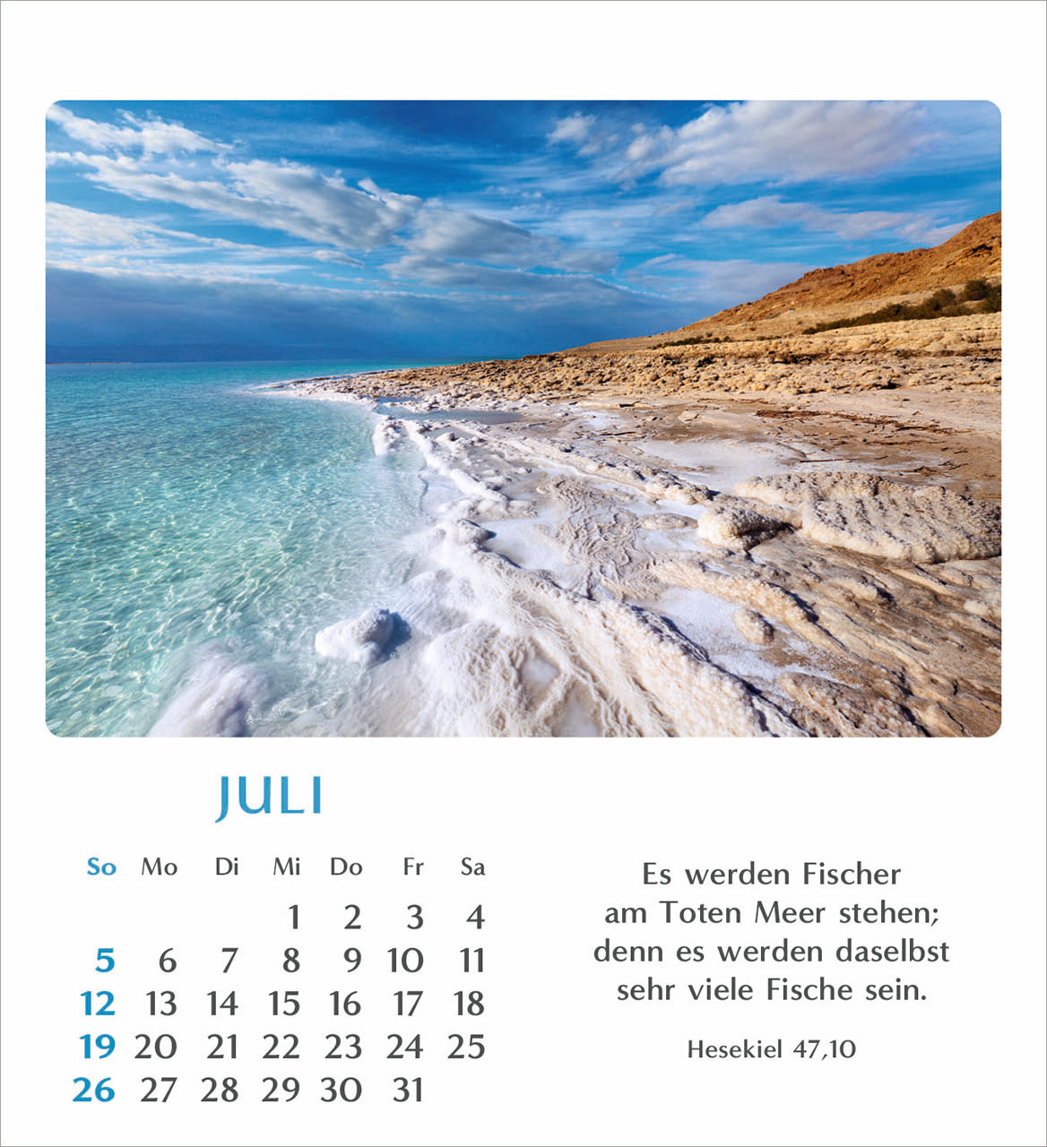 Erstaunlich vielfältig und farbenfroh begegnet uns Israel in diesem schönen Kalender. Herrliche Ausblicke aufs Rote Meer oder auf Masada, eindrückliche Bilder aus der Altstadt Jerusalems oder Impressionen aus der Wüste Negev. Ein wundervoller Bilderbogen Israels mit ansprechenden Versen aus der Bibel.