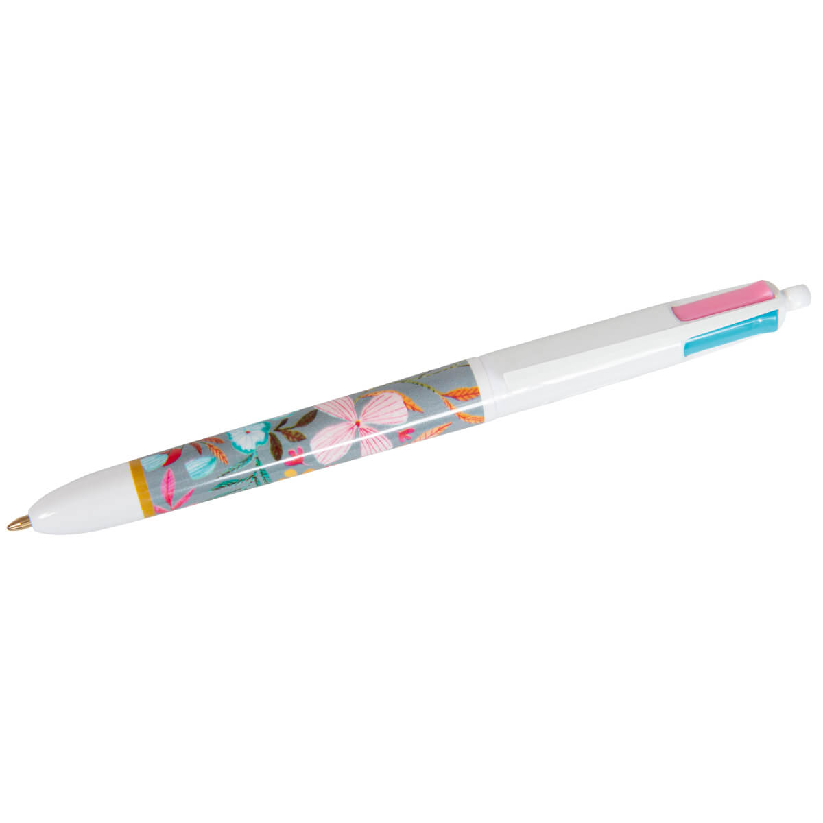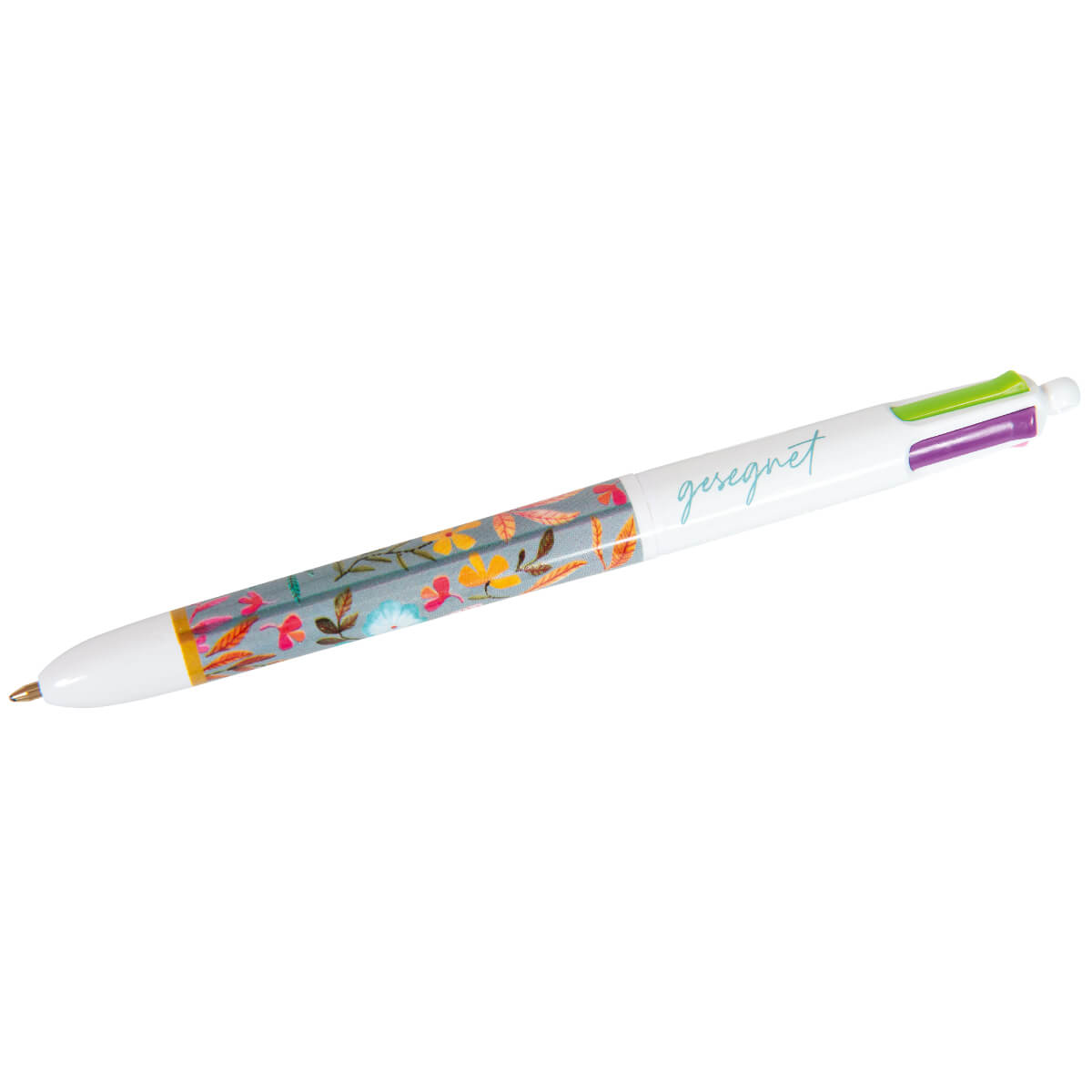 Der beliebte 4-Farb-Kugelschreiber von BIC ist auf dem unteren Schaft mit dem schönen neuen Blumenmotiv bedruckt, den oberen Teil ziert der Schriftzug "gesegnet".