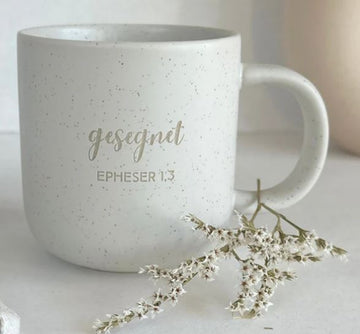 Hochwertige und elegante Steingut-Tasse für gemütliche Kaffee- oder Tee-Momente. Robust, langlebig und stilvoll - perfekt für den täglichen Gebrauch. Die präzise Gravur "Gesegnet - Epheser 1,3" erinnert dich täglich an Gottes unendliche Gnade und Liebe. Ob zum Start in den Tag oder für eine ruhige Auszeit - diese Tasse schenkt dir Kraft und Inspiration mit jedem Schluck. Ein besonderes Geschenk für dich selbst oder deine Liebsten.