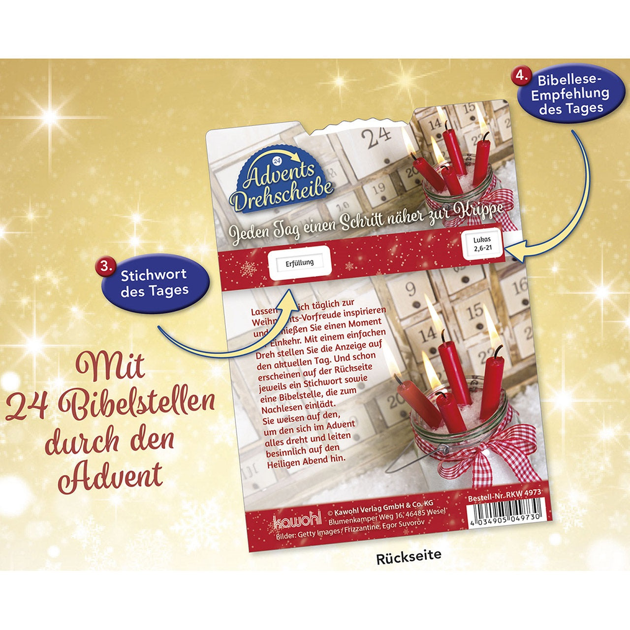 Lassen Sie sich täglich zur Weihnachts-Vorfreude inspirieren und genießen Sie einen Moment der Einkehr. Mit einem einfachen Dreh stellen Sie die Anzeige auf den aktuellen Tag. Und schon erscheinen auf der Rückseite jeweils ein Stichwort sowie eine Bibelstelle, die zum Nachlesen einlädt. Sie weisen auf den, um den sich im Advent alles dreht und leiten besinnlich auf den Heiligen Abend hin. Die Advents-Drehscheibe begeistert als kreative Dekoration und überraschendes Geschenk und lässt sich optimal verschicken.