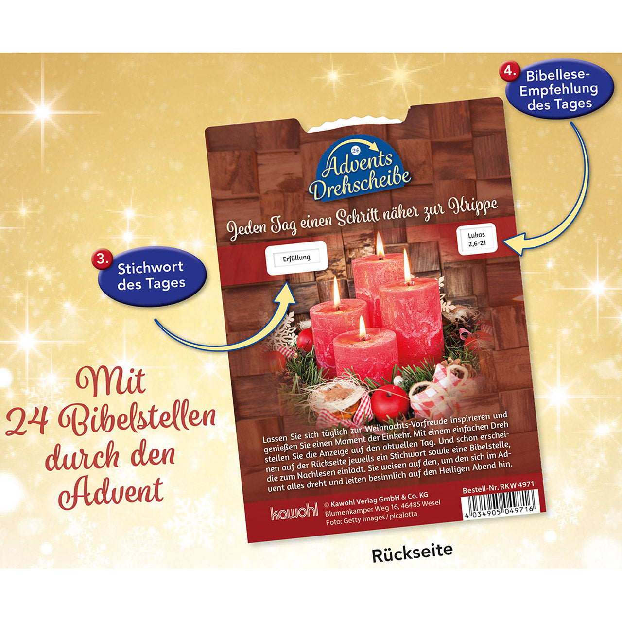 Lassen Sie sich täglich zur Weihnachts-Vorfreude inspirieren und genießen Sie einen Moment der Einkehr. Mit einem einfachen Dreh stellen Sie die Anzeige auf den aktuellen Tag. Und schon erscheinen auf der Rückseite jeweils ein Stichwort sowie eine Bibelstelle, die zum Nachlesen einlädt. Sie weisen auf den, um den sich im Advent alles dreht und leiten besinnlich auf den Heiligen Abend hin.