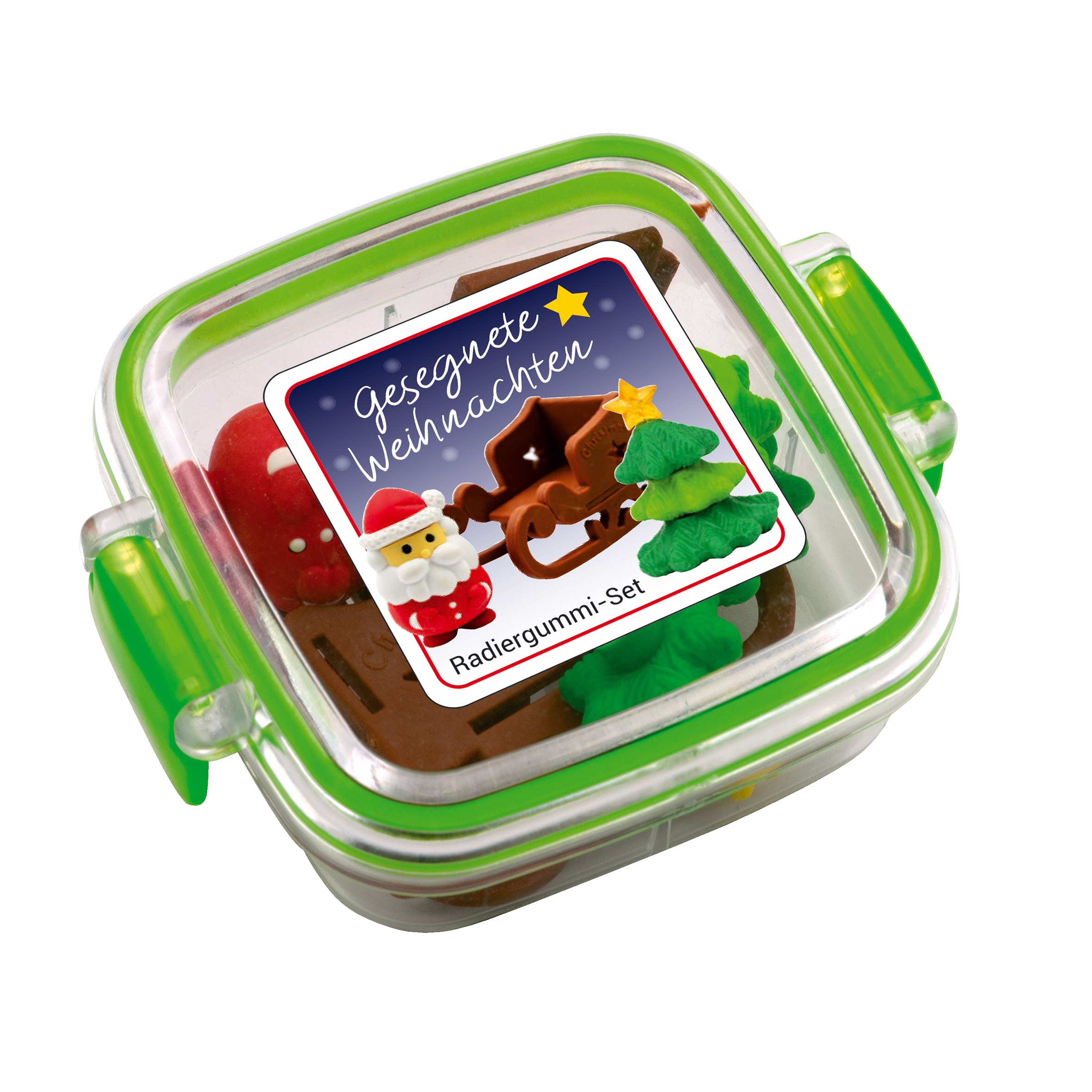 Gleich mehrere weihnachtliche Mini-Radiergummis lassen sich mit dem Radiergummi-Set "Weihnachten" verschenken. Das mehrteilige Set besteht aus "Weihnachtsbaum" (ca. 3 x 3,9 x 3 cm) und "Weihnachtsmann"