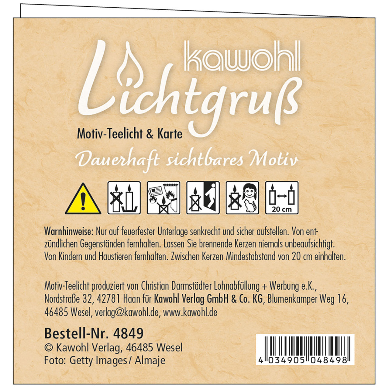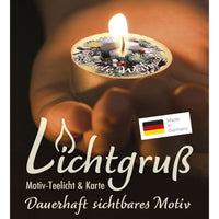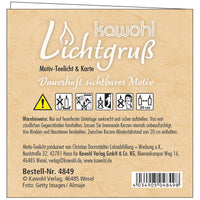 Ein kleiner Lichtgruß mit einer passenden Faltkarte (Format 9 x 9 cm). Das Teelicht ist auf besondere Weise veredelt. Beim Abbrennen schwimmt die Botschaft auf dem flüssigen Wachs und bleibt so - bis auf ein kleines Loch um die Flamme herum - sichtbar.
