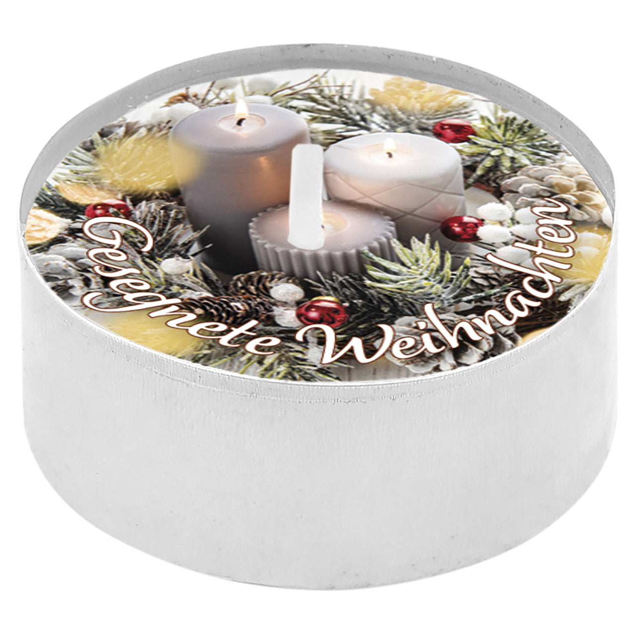 Text auf dem Teelicht: Gesegnete Weihnachten