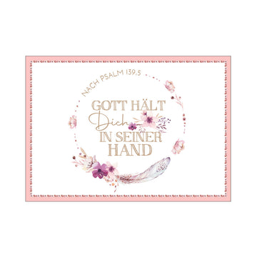Für kleine Grüße oder als Mini-Poster: Postkarte im schönen Design Kranz mit Feder "Gott hält Dich in seiner Hand" auf stabilem Postkartenkarton mit edler partieller Lackierung.
