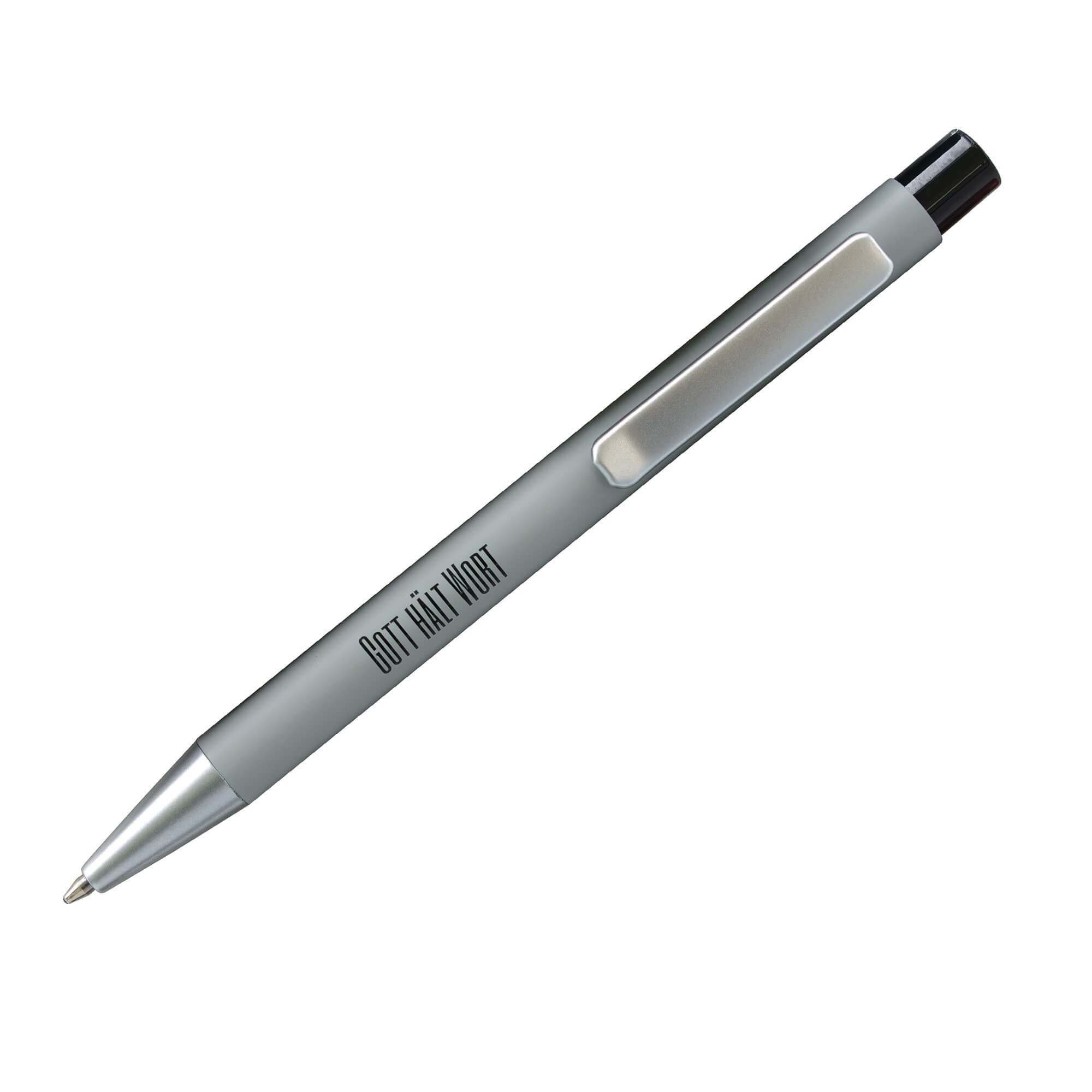 Glänzend in Szene gesetzt wird der Vers "Gott hält Wort" dank der farbigen Unterlegung. Das sorgt für eine effektvolle Gravur. Mit farblich dazu passendem Drücker.