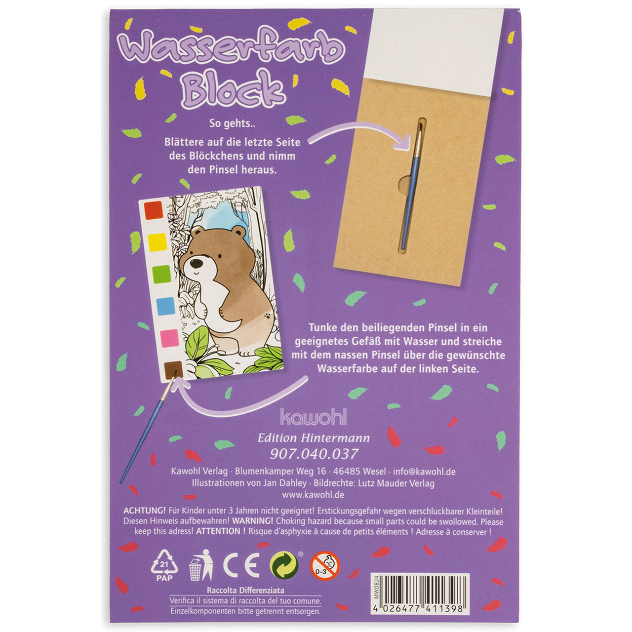 Liebevoll gestalteter Malblock mit 12 unterschiedlichen Motiven. Auf jeder Seite ist am Rand eine Farbpalette, die man mit dem beiliegenden Pinsel und etwas Wasser aktivieren und verwenden kann.