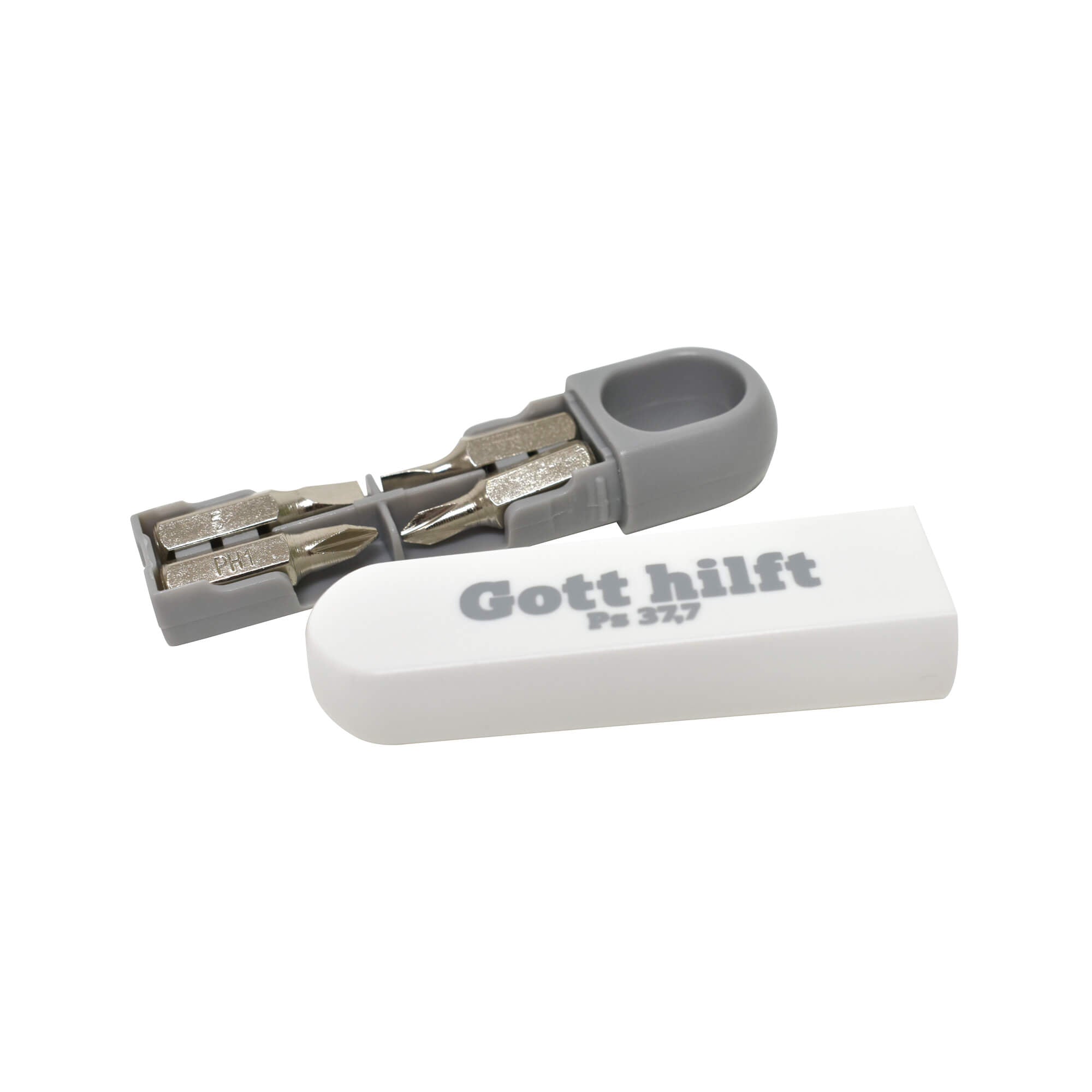 Praktisch: Durch einen Magnet werden die Bits an der Spitze des Gehäuses befestigt. Bedruckt ist das Werkzeug für die Hosentasche mit dem Text "Gott hilft - Ps 37,7".
