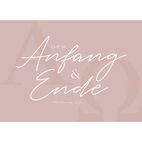 Text auf der Rückseite: Ich bin das Alpha und das Omega, der Erste und der Letzte, der Anfang und das Ende.