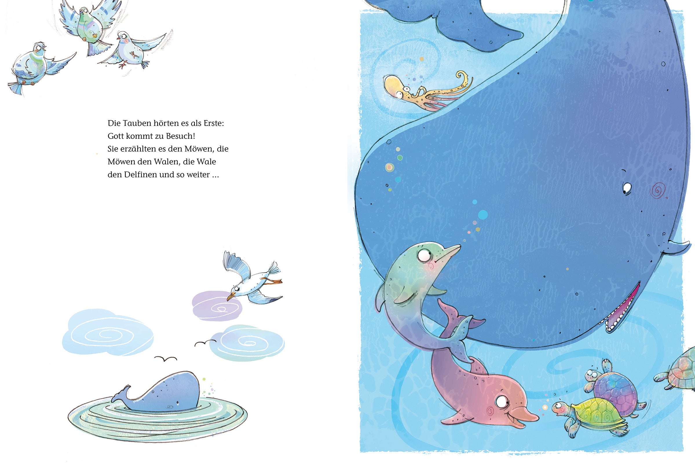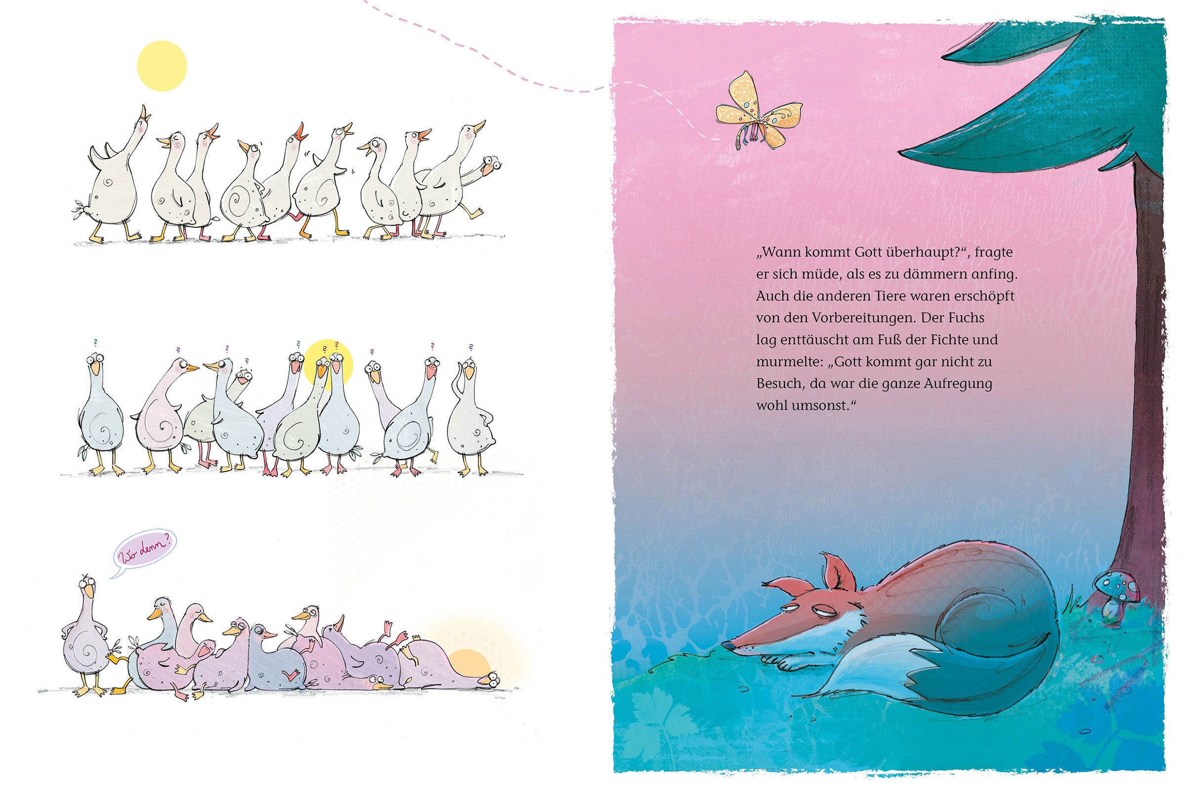 Die Nachricht verbreitet sich blitzschnell: Gott kommt zu Besuch! Jedes Tier will etwas tun, um Gott zu beeindrucken. Aber was ist besonders genug? Und wann kommt Gott eigentlich?