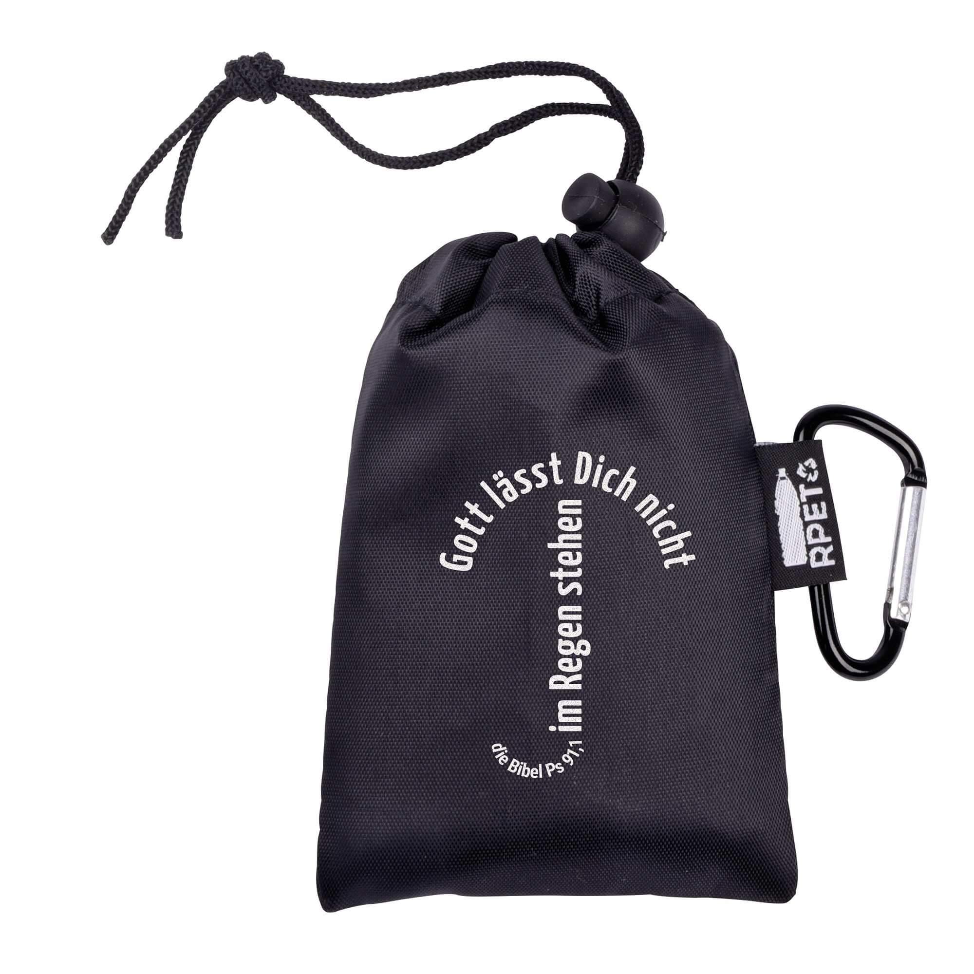 Bedruckt ist der handliche Beutel, 8 x 12 cm, mit "Gott lässt dich nicht im Regen stehen - die Bibel Ps 91,1"