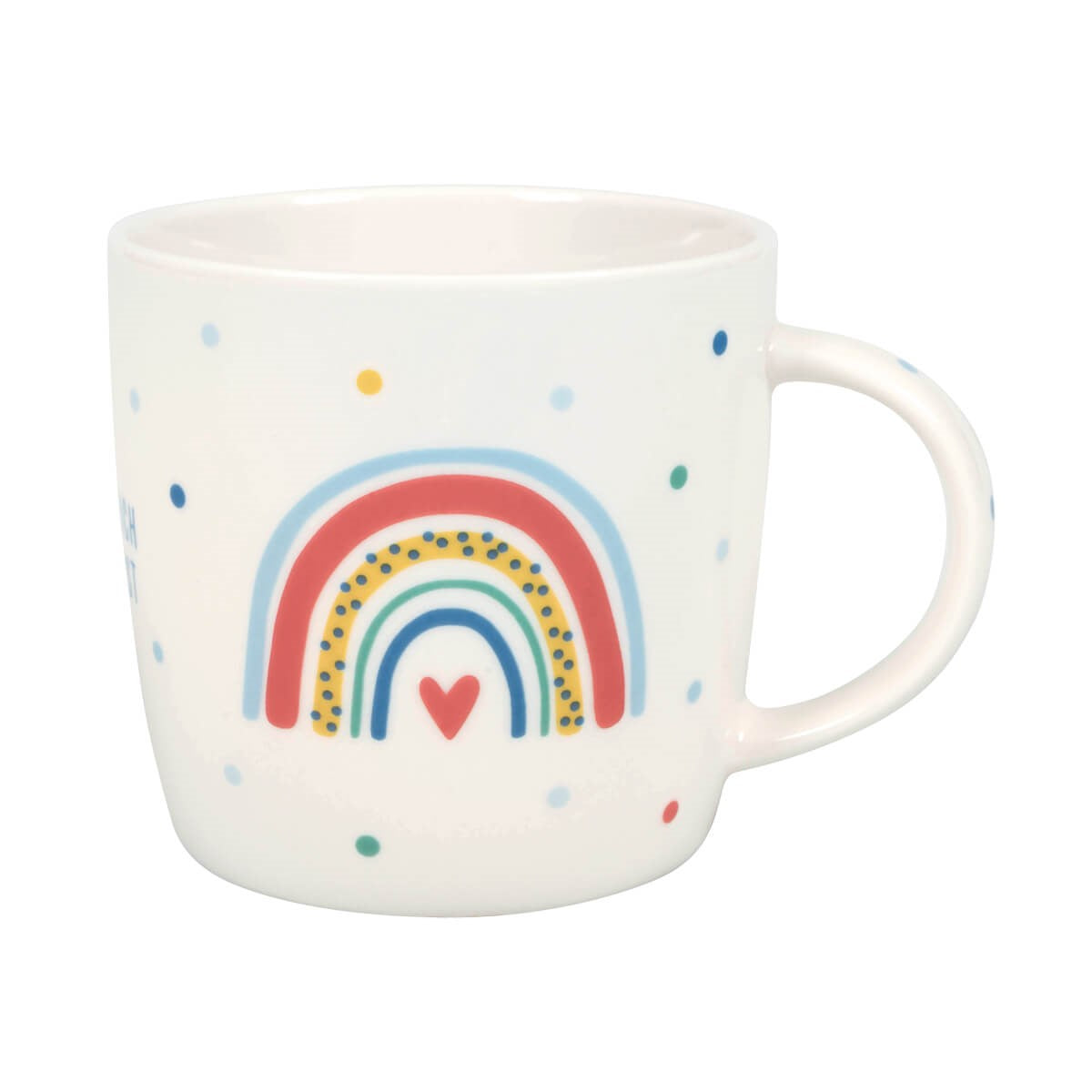 Ideale Größe für Kinder: Tasse aus Porzellan mit schönem buntem Motiv Regenbogen und Text "Gott liebt dich so wie du bist".