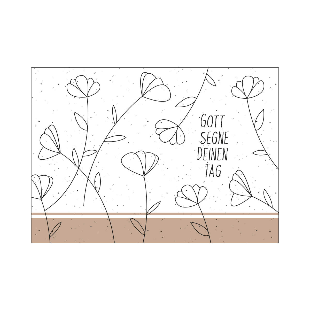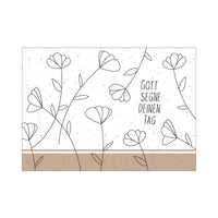 Für kleine Grüße, Mini-Poster oder als Geschenkanhänger: Postkarte mit stilisierten Blumen und aufmunterndem Text: Gott segne Deinen Tag.