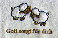 Farbe Weiß mit beiger Umbördelung und Sticktext, 100% Baumwolle, bestickt, Text: "Gott sorgt für dich"