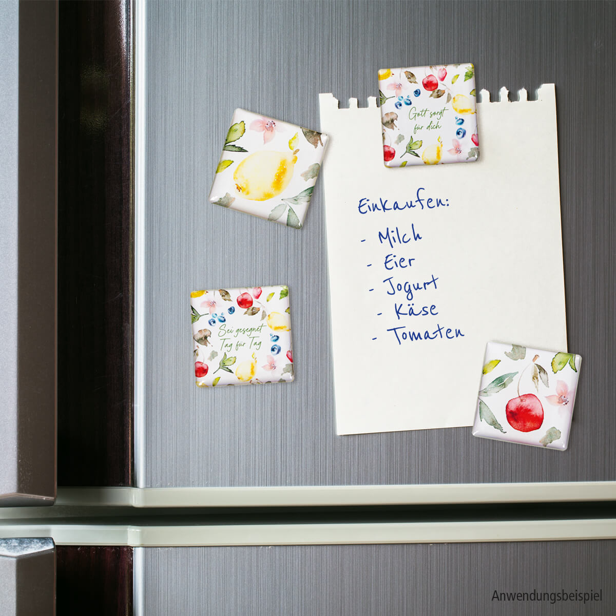 4 schöne Magnete im Set! Je zwei Stück mit Text und Früchten. Eine trendige Kleinigkeit zum Verschenken, oder als schöne Dekoration am Kühlschrank oder der Magnetwand.