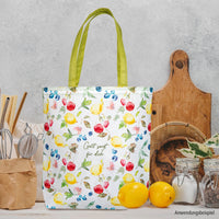 Mit buntem Früchtemotiv und der Aussage:
