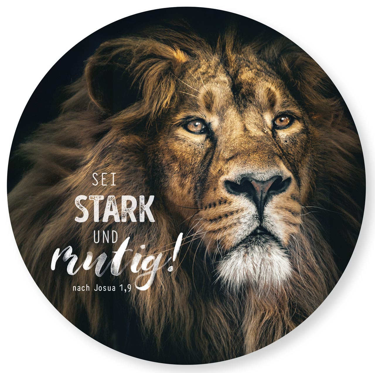 Das Design zeigt einen majestätischen Löwen, detailreich illustriert und Ausdruck von Mut, Würde und göttlicher Stärke. Im Zentrum steht der ermutigende Bibelvers: