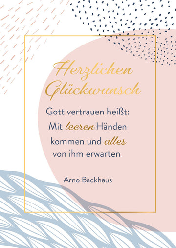 Doppelkarte mit Spruch von Arno Backhaus "Gott vertrauen heißt: Mit leeren Händen kommen und alles von ihm erwarten." Doppelkarte mit Relieflack mit Kuvert. VE: 5 Doppelkarten
