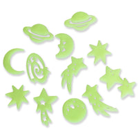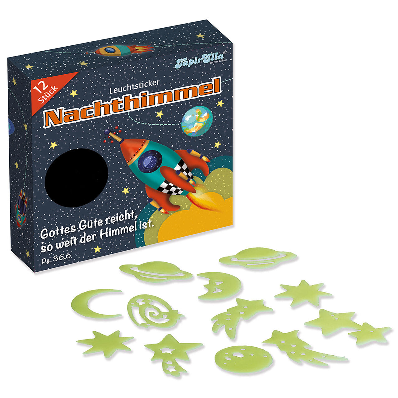Spaß im Dunkeln. Nachleuchtende Leuchtsticker mit Raketen- und Planeten-Motiven. Macht das Kinderzimmer zum Planetarium. Der Text befindet sich auf der Verpackung.
