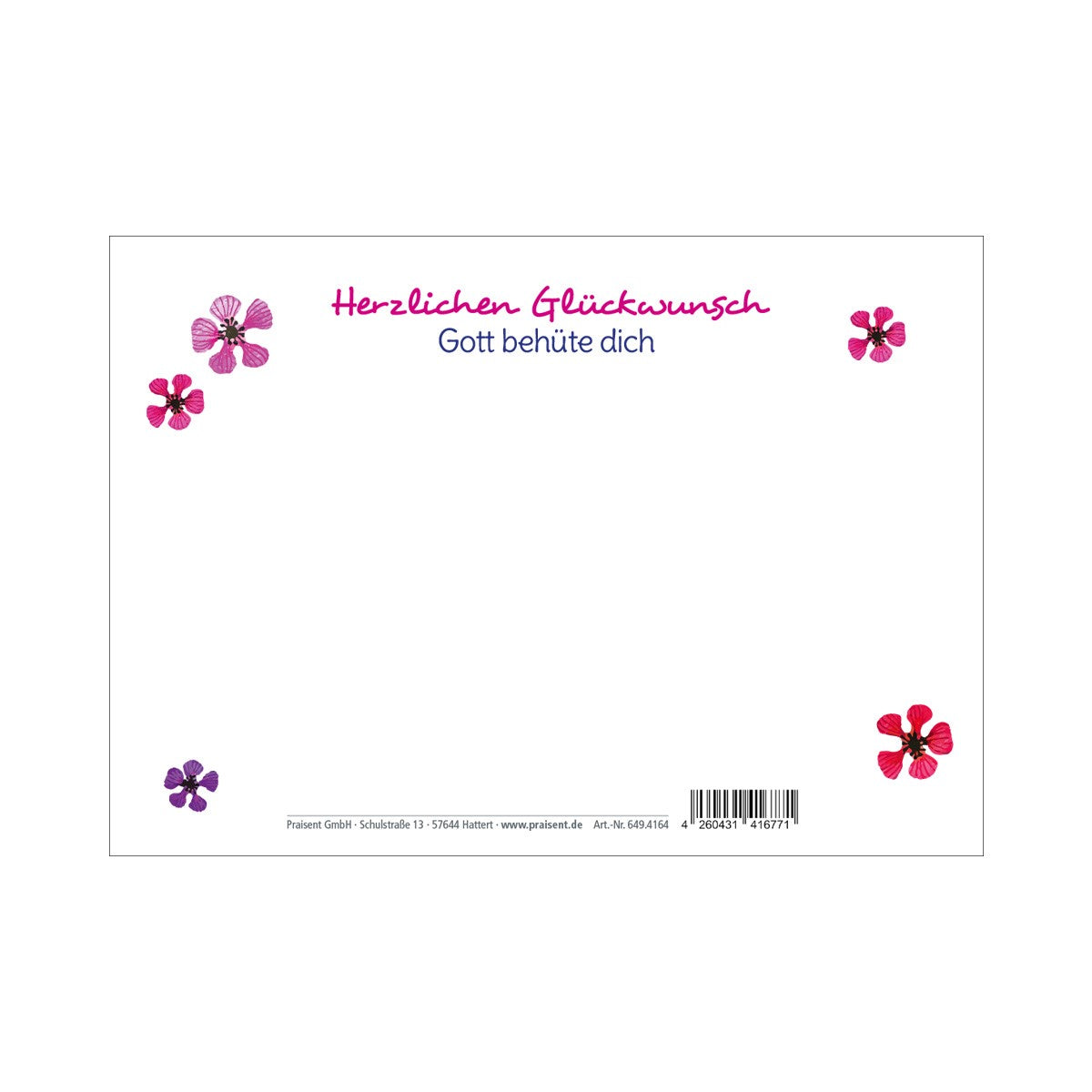 Auf der Rückseite der Text: Herzlichen Glückwunsch & Gott behüte dich.