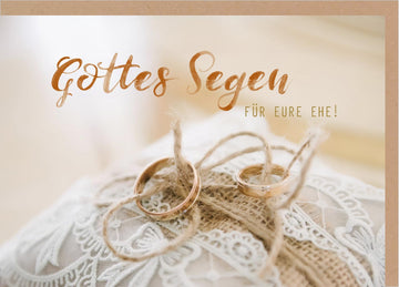Übermittle deine Segenswünsche zur Hochzeit mit dieser edlen Faltkarte. Auf der Vorderseite ist ein Ringkissen mit zarter Spitze abgebildet, auf dem die Eheringe eines Paares angebunden sind - ein klassisches Symbol für die Verbindung zweier Menschen. Der Schriftzug "Gottes Segen für eure Ehe!" ist in goldveredelter Typografie gestaltet und verleiht der Karte einen besonderen Glanz.