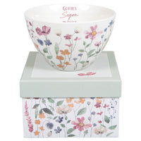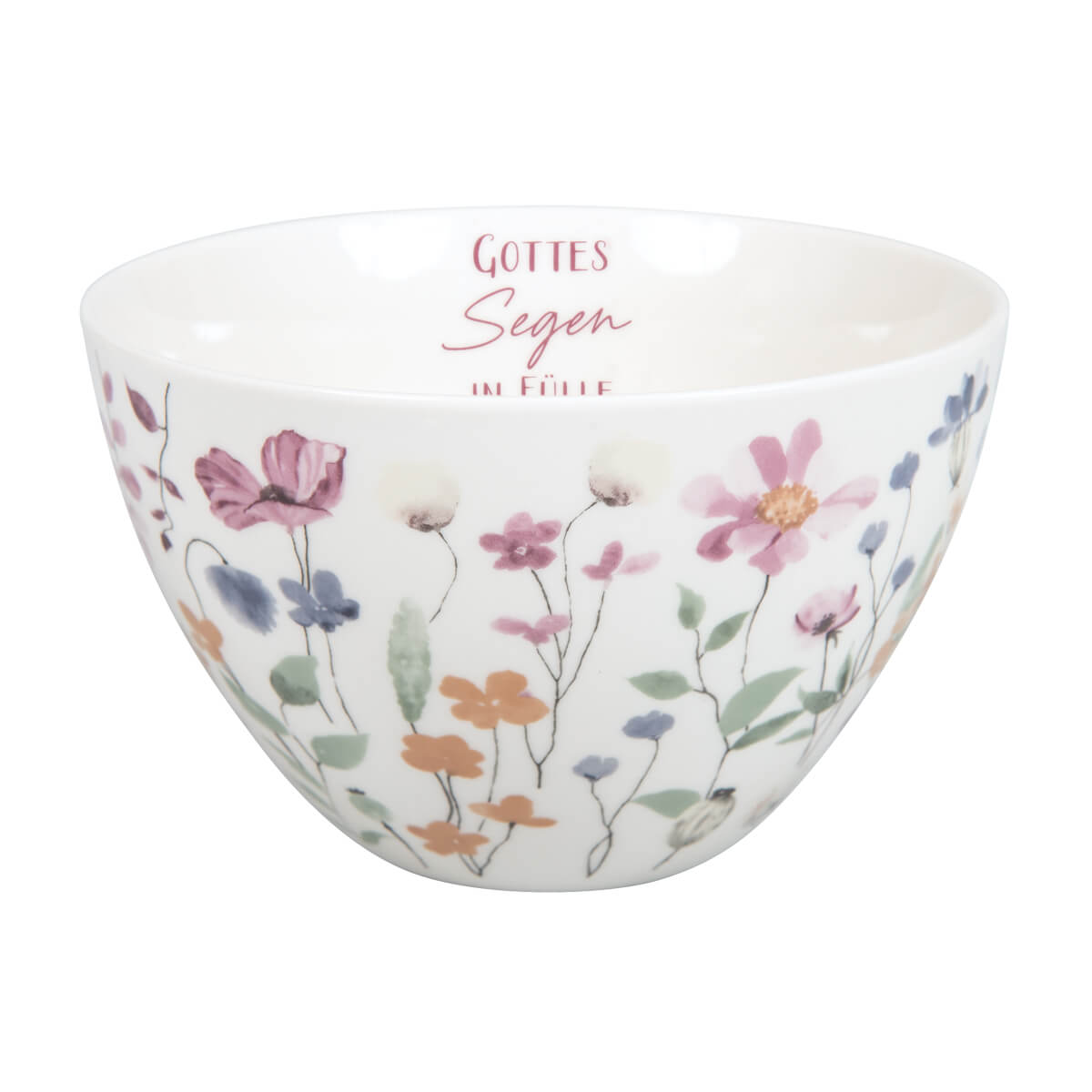 Passend zur großen Jumbotasse (6495273) gibt es auch diese Müslischale in neuer, großer Form. Das Blumendesign und der Text "Gott Segen in Fülle" im Inneren machen die Schale zum Blickfang auf dem Tisch, z.B. für Knabbereien.
