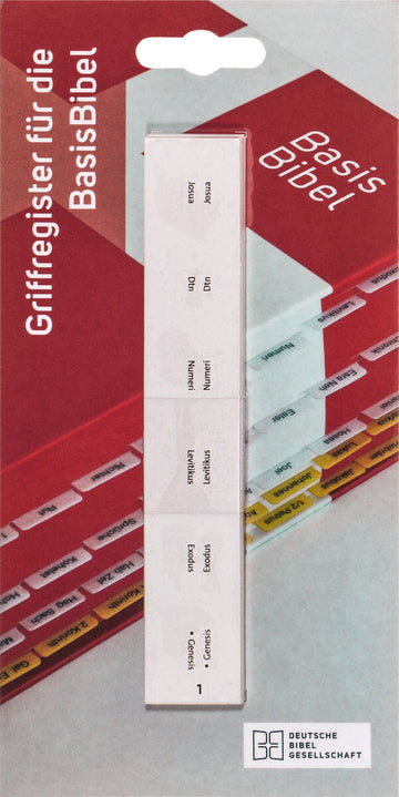 Wo steht noch gleich der Phillipperbrief? Wer mit einem Griff das gewünschte Buch in der Bibel finden will, für den ist ein Bibelgriffregister das richtige Hilfsmittel. Strapazierfähige kleine Registerfähnchen aus Kunststoff halten mindestens so lange wie eine Bibel, die gerne und viel gelesen wird. Einmal hineingeklebt, vereinfachen sie das Hin- und Herblättern und ermöglichen das rasche Nachschlagen von Querverweisen zu anderen biblischen Büchern.