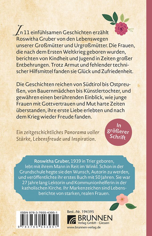 Roswitha Gruber erzählt in 11 einfühlsamen Geschichten von den bewegenden Lebenswegen unserer Großmütter und Urgroßmütter. Die Frauen, die nach dem Ersten Weltkrieg geboren wurden, berichten von ihrer Kindheit und Jugend in Zeiten großer Entbehrungen. Trotz Armut und fehlender technischer Hilfsmittel fanden sie Glück und Zufriedenheit.