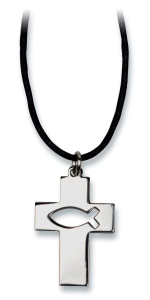 Halskette mit Kreuz-Anhänger (2 x 2,8 cm) mit Ausstanzung Ichthys-Fisch aus glänzendem Metall, mit schwarzem Stoffband (bis 70 cm verlängerbar)