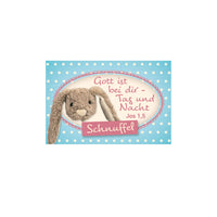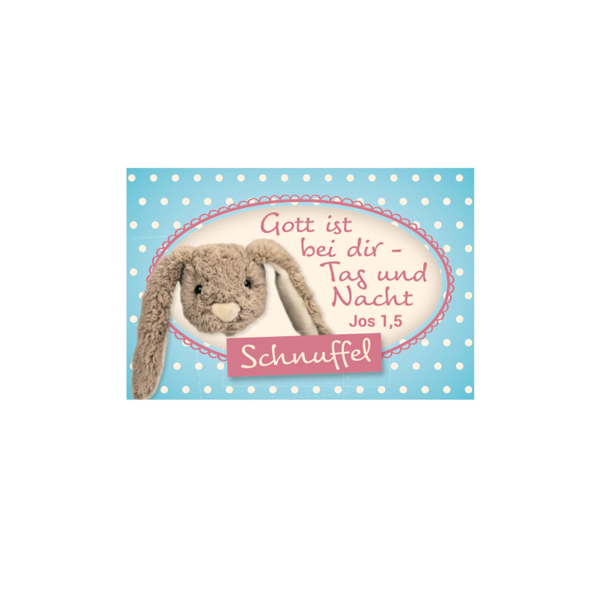 Versehen ist der Plüschhase mit einem Schmuckkärtchen und dem Aufdruck "Gott ist bei dir - Tag und Nacht. - Jos 1,5".
