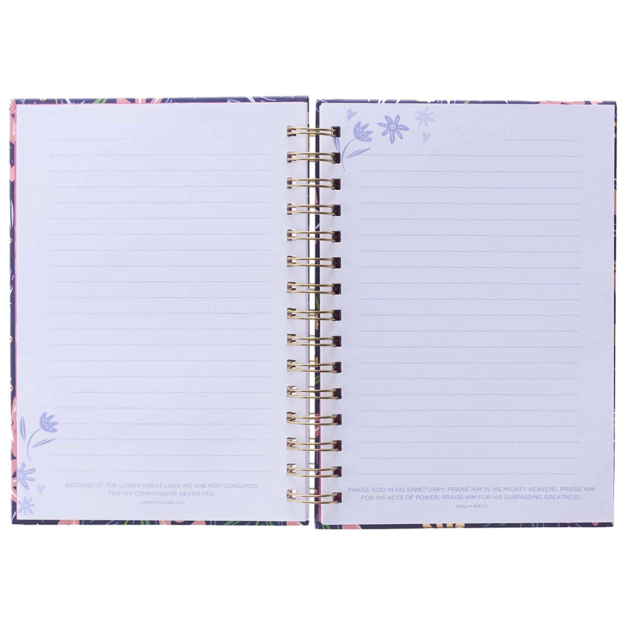 Hochwertiges Notizbuch mit praktischer Spiralbindung. So lassen sich die Seiten besonders leicht blättern und komplett umschlagen. Mit je einem englischen Bibelvers auf jeder linierten Seite. Strapazierfähiger Hardcover-Einband mit Motiv-Druck und -Prägung, teilweise mit Metallfolien-Akzenten. Extra-stabile Bindung mit beschichteter Drahtspirale.