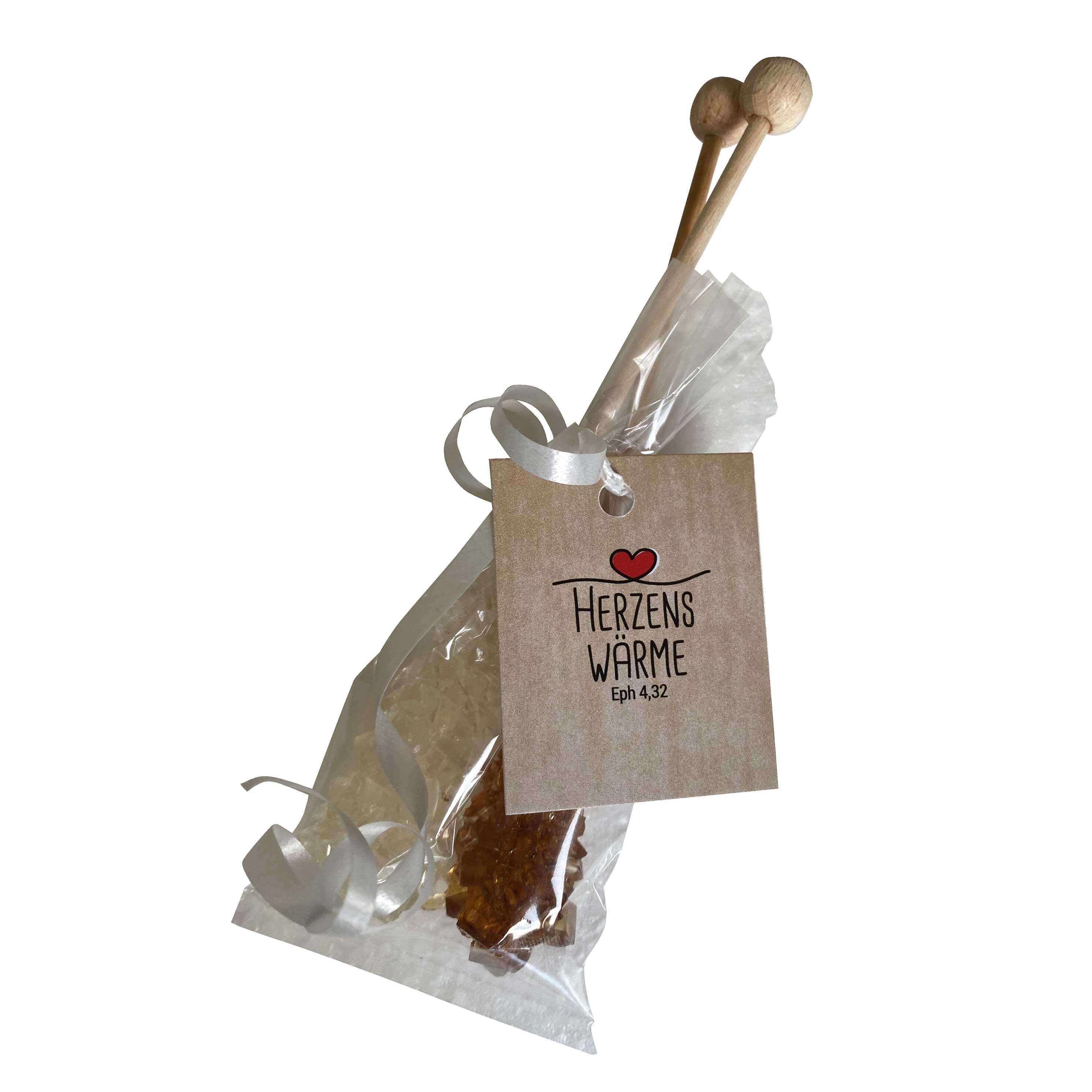 Die zwei in Geschenkfolie verpackten Kandis-Sticks (weiß/braun) sind die ideale Ergänzung zu unserem 3er-Set Tee "Herzenswärme Eph 4,32".