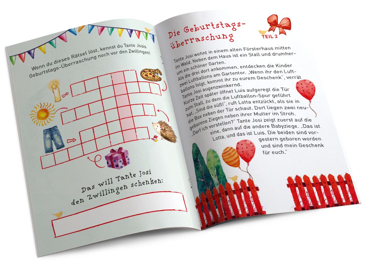 Mit dieser liebevoll gestalteten Geburtstagskarte können Eltern, Gemeindemitarbeiter, Lehrer und alle, die einem Kind gratulieren möchten, ihre besten Grüße übermitteln. Auf den zwölf Seiten der Karte findet das Geburtstagskind lustige Rätsel, eine neue Kurzgeschichte mit Lotta und Luis und die guten Gedanken: Du bist wertvoll! Gott hat dich geschaffen und er hat dir viele geniale Gaben geschenkt.