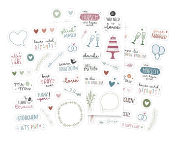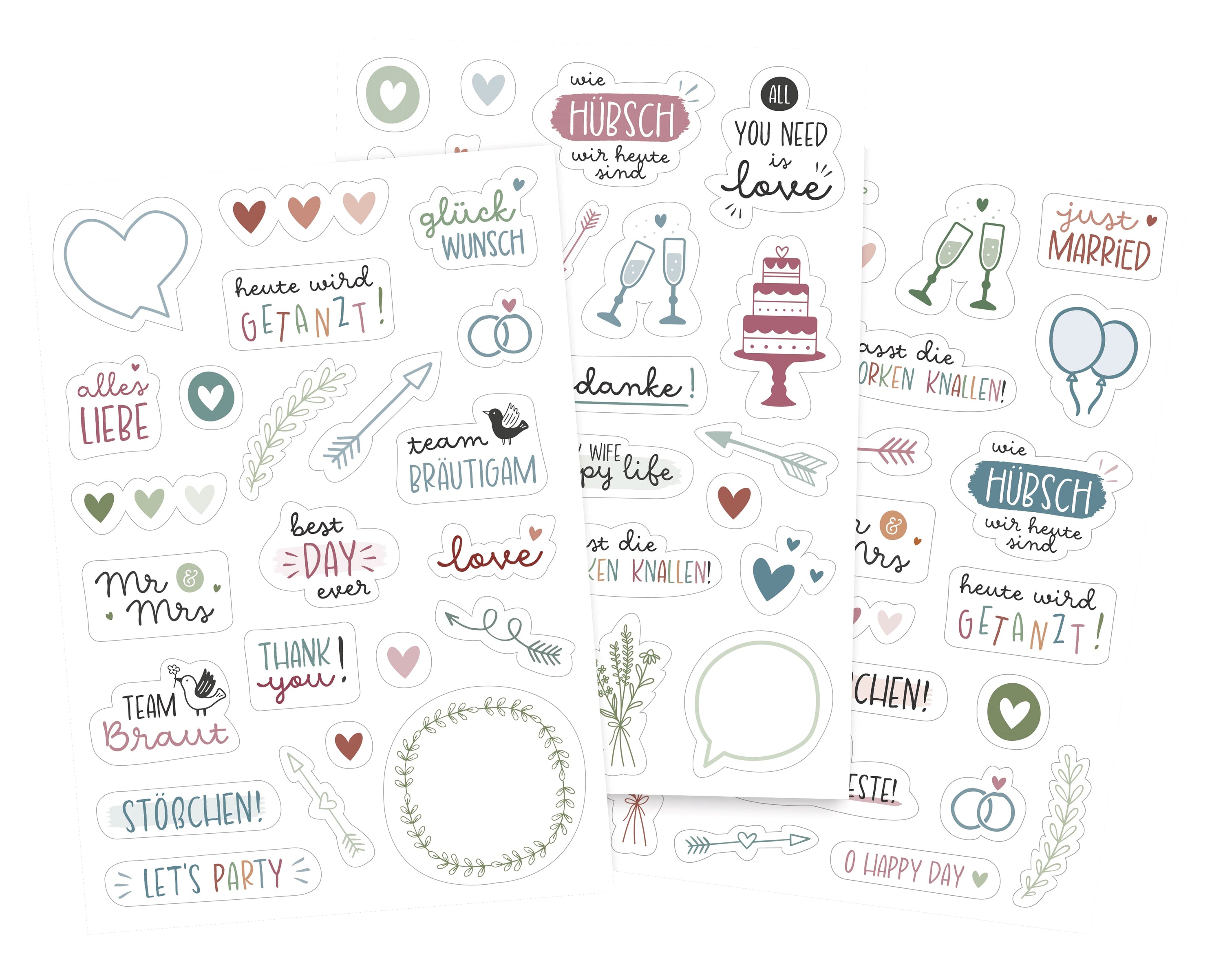 Dieses Hochzeitssticker-Set enthält: Über 100 farbig illustrierte Sticker im angesagten Design. Passend zu jeder Hochzeitsfeier, als Ergänzung zum Gästebuch (193296) oder als Verzierung der Glückwunschkarte.