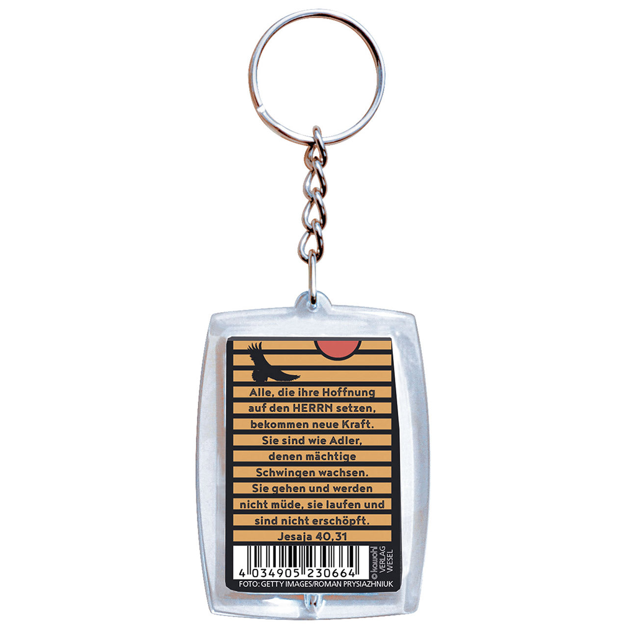 Schlüsselanhänger aus glasklarem Plexiglas, mit starker Anhängerkette.