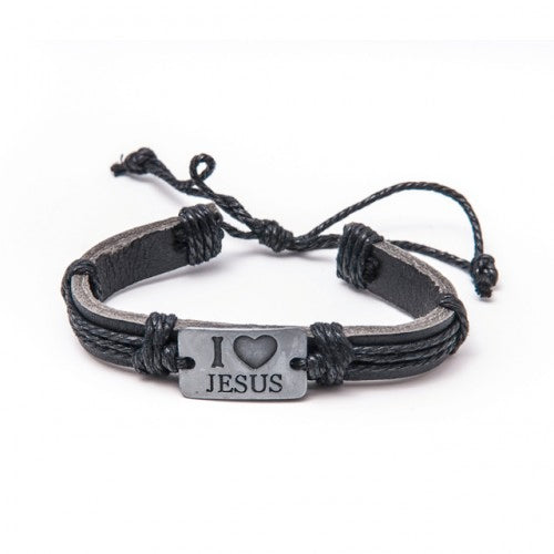 Schönes Armband "I love Jesus". Aufwendig verarbeitet mit schwarzen Leder, Bändern und Metallplatte.