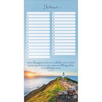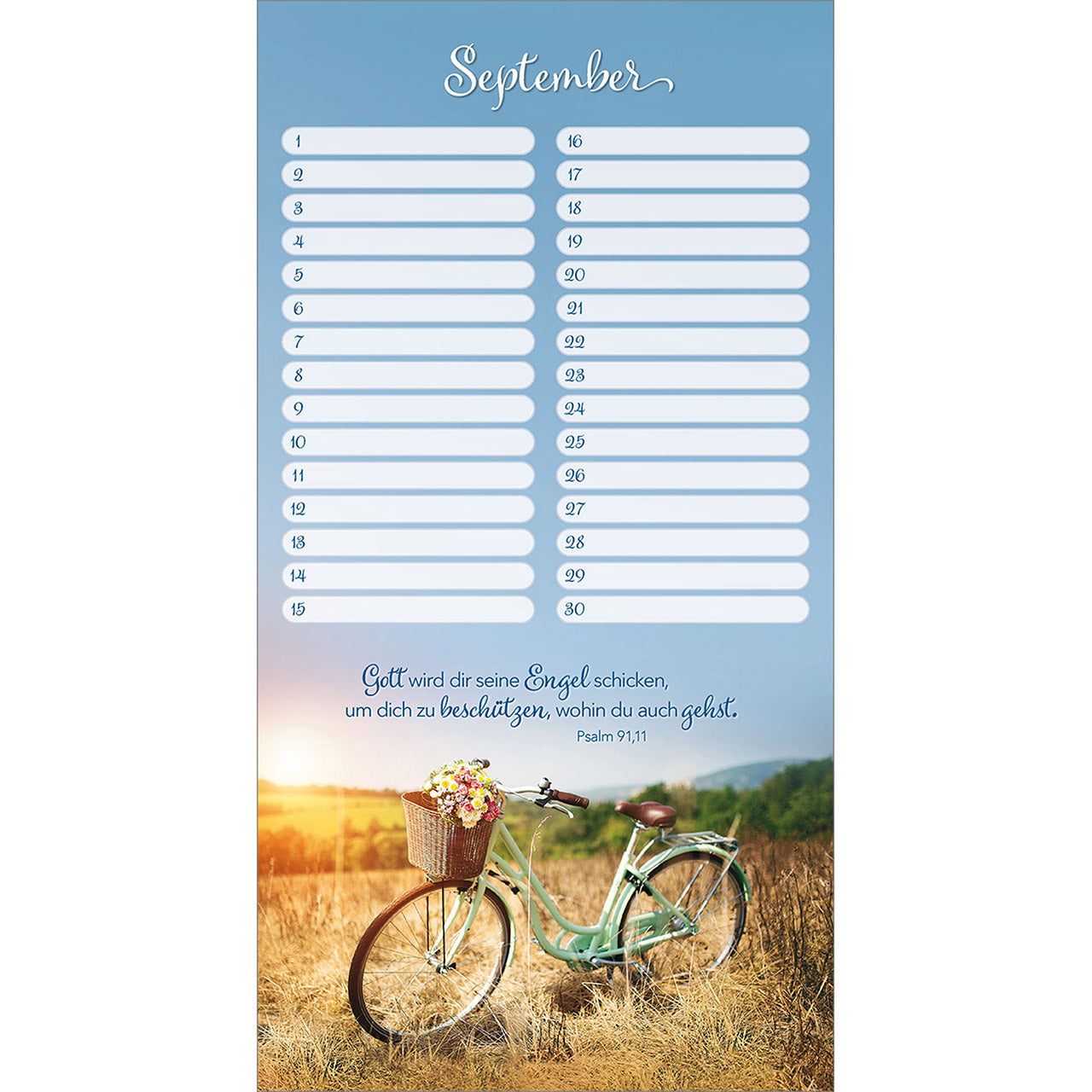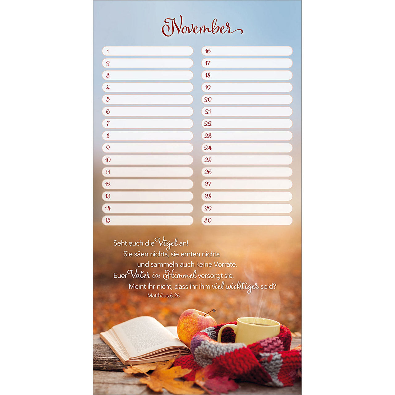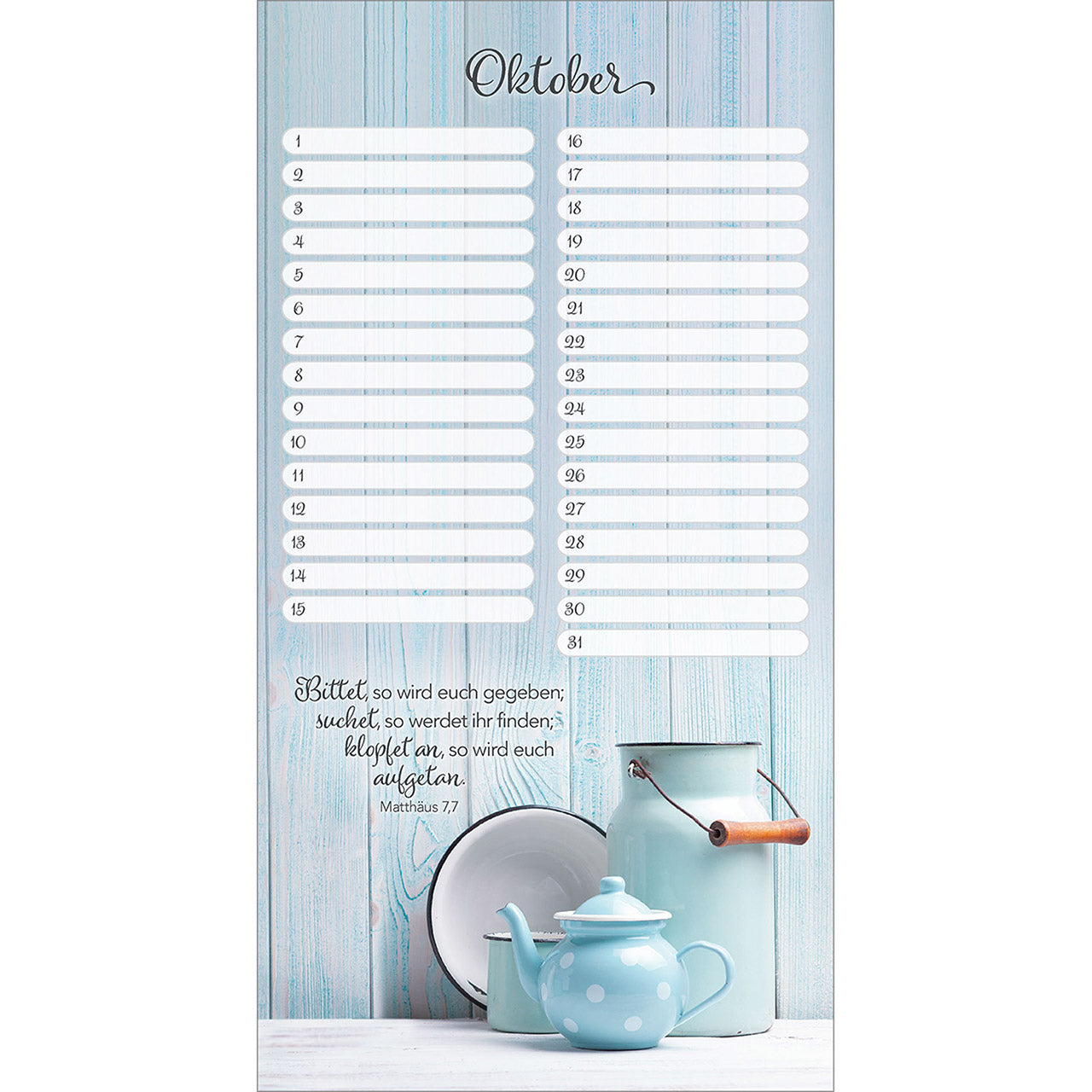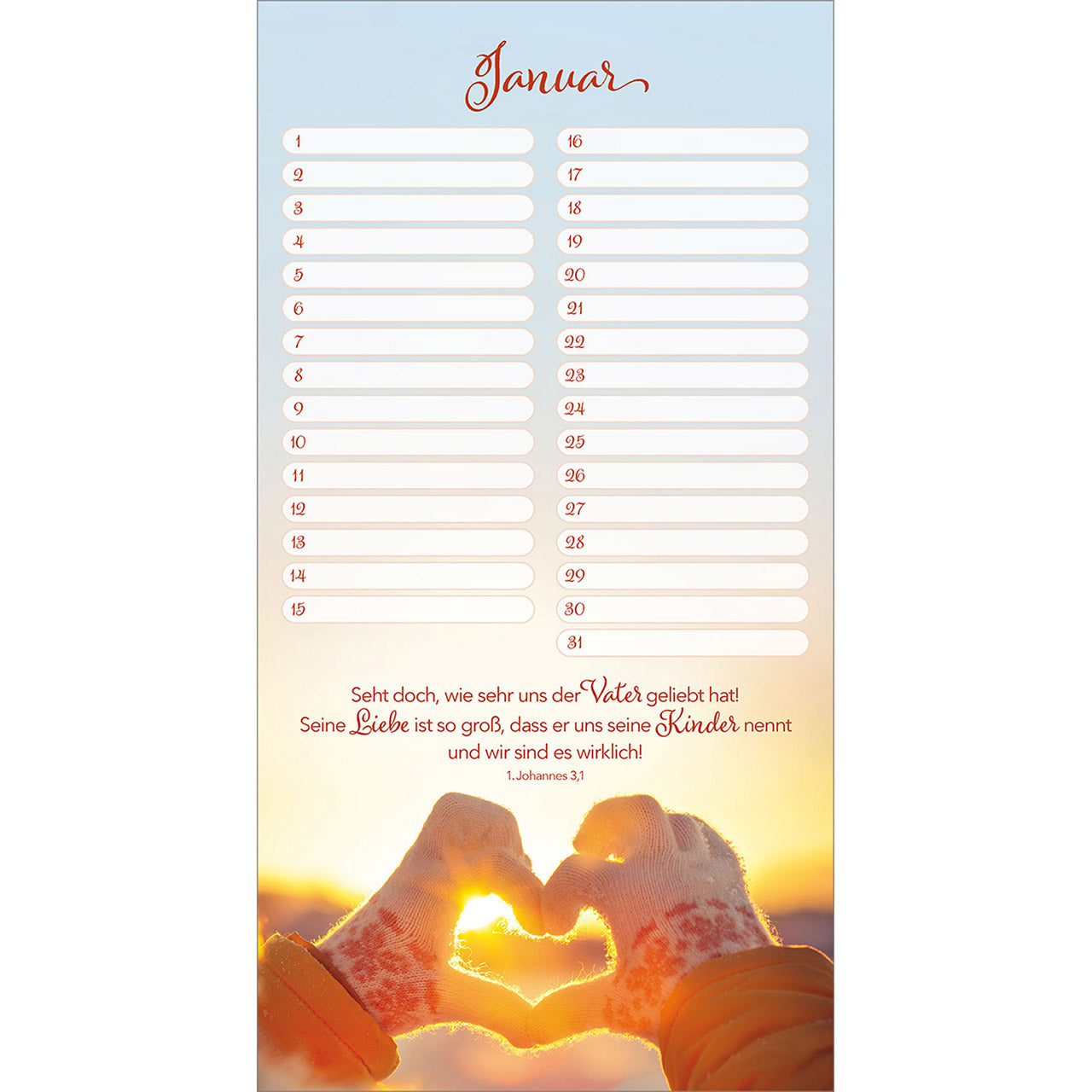 Mit diesem wunderschönen Wandkalender vergessen Sie nie wieder Geburts- und Jahrestage. Stimmungsvolle Bilder mit wertvollen Bibelversen begleiten Sie jedes Jahr aufs Neue und sind im praktischen Hochformat ein echter Blickfang. Zusätzlich gibt es genügend Spalten um alle Geburts-, Fest- oder Trauertage von Freunden und Verwandten einzutragen. Dieser Kalender ist somit nicht nur praktisch, sondern auch sehr dekorativ und ermutigend. Ein wertvoller Begleiter für viele Jahre.