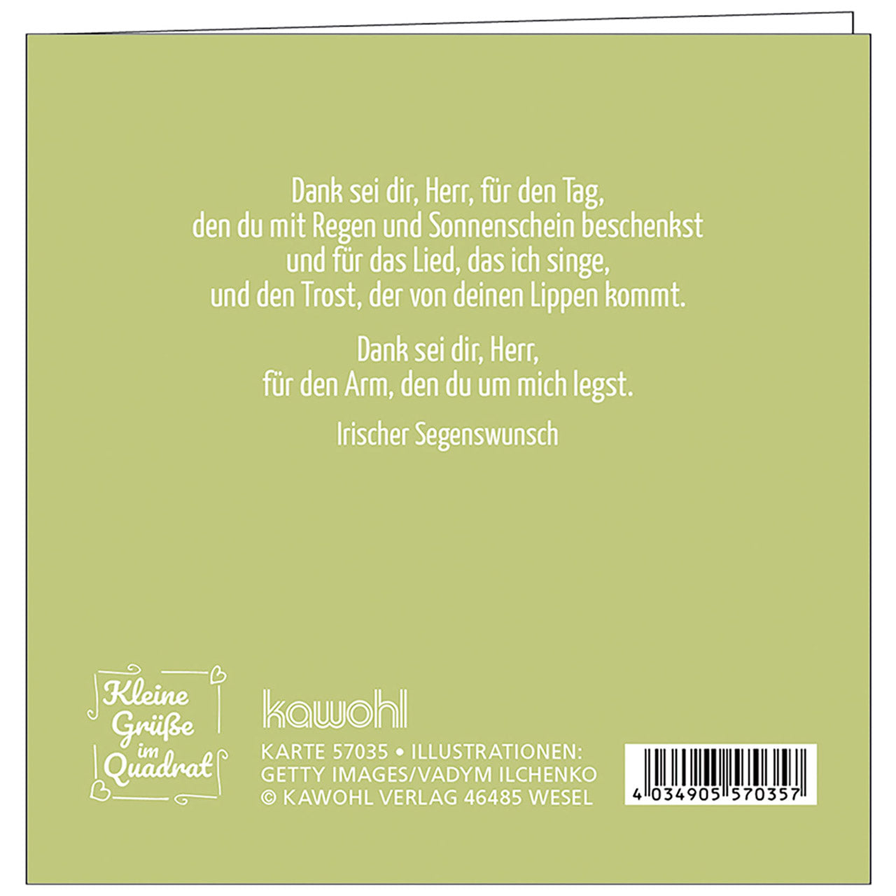 Dank sei dir, Herr, für den Tag, den du mit Regen und Sonnenschein beschenkst und für das Lied, das ich singe, und den Trost, der von deinen Lippen kommt. Dank sei dir, Herr, für den Arm, den du um mich legst.