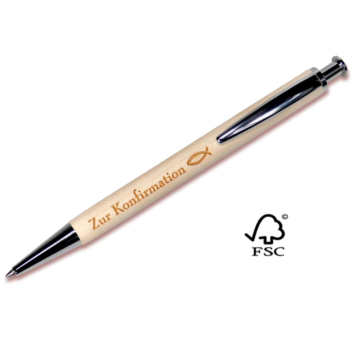 Holzkugelschreiber mit Lasergravur "Zur Konfirmation/Ichthys", Metallclip, hochwertig verpackt in schönem Holzetui, Minenfarbe: blau. Kugelschreiber und Etui sind aus FSC-zertifiziertem Holz; d.h. aus kontrolliert geholztem Waldbestand/Wiederaufforstung